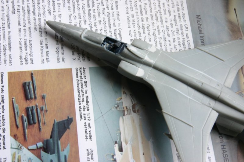 Nach Erhalt der einsitzigen Revell- Jaguar und erster Passproben musste ich feststellen, dass der Resinsitz nicht in die Cockpitwanne passt. Auch ist es fraglich, ob sich das geätzte Armaturenbrett problemlos einbauen lässt. Ärgerlich warf ich die Teile erst einmal in die Ecke und beschloss, später doch das Hobycraft- Modell zu bauen.