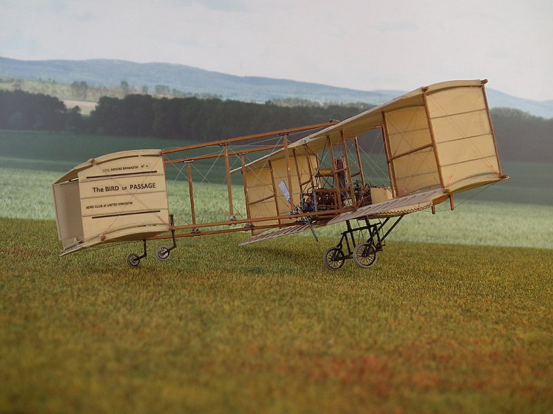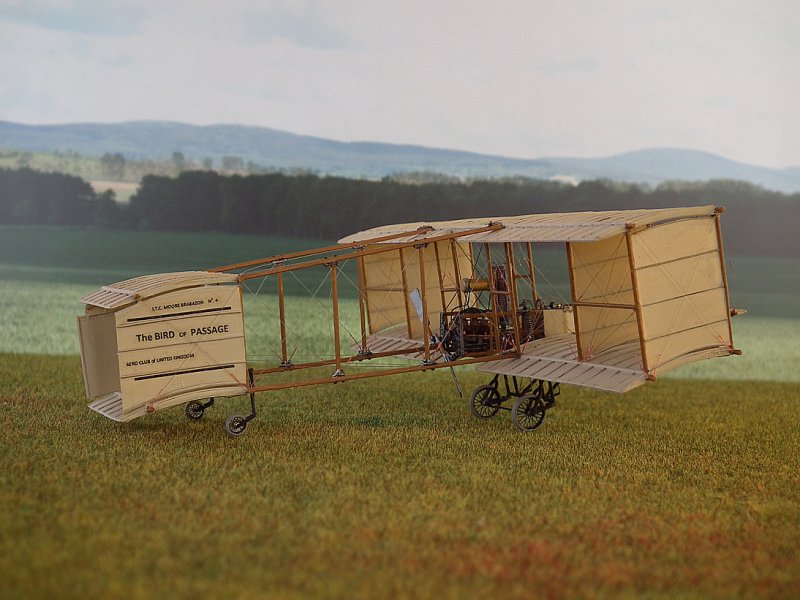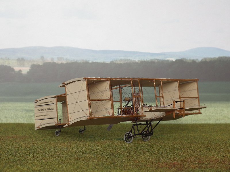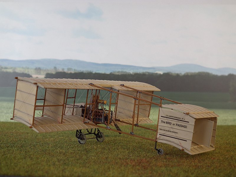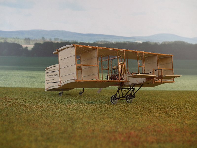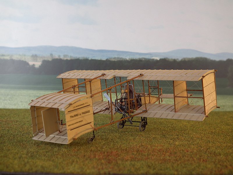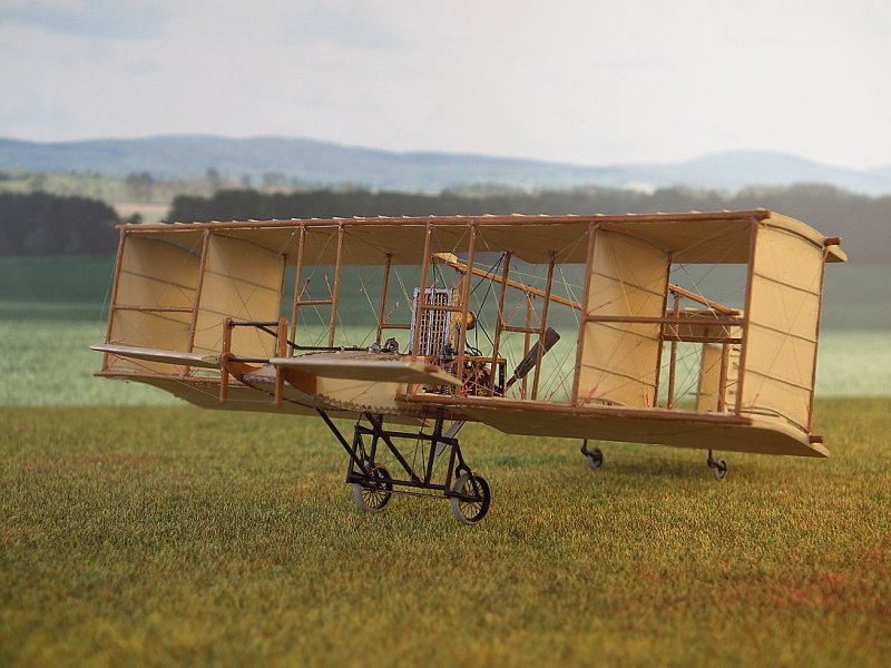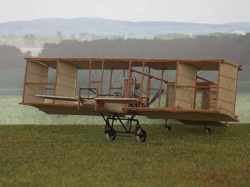 Die Stiele derTragflächenstreben bestehen aus Kupferrohr 0,6/0,8 mm.Dazwischen wurden, wo beim Original die Leinwandverkleidungen waren,dünne Platten aus dem Trennblatt eingeklebt und mit Borsteneines Handfegers die Versteifungen angedeutet. Dabei musste ichfeststellen, dass mein Riss aus dem Internet in diesem Detail falschist. Die Tragflächen in der Draufsicht haben, auf 1:72hochskaliert, 2,0 cm Holmabstand. In der Seitenansicht wird derAbstand der Streben mit 2,2 cm gezeichnet. Außerdem stimmt derWinkel nicht. Ich bin prompt darauf reingefallen. Nach Prüfungzeigte sich, dass der Grundriss mit 2,0 cm wahrscheinlich richtigist, da ich dort eine Bemaßung finde, die Zeichnung von GlobalFlight vom 04. August 1909 dieses Maß zeigt und auch besser mitden Originalphotos übereinstimmt. Im Weiteren habe ich michdeshalb an den Riß aus der Global Flight orientiert (leidergibt es dort keine Frontansicht). Also wurden die äußeren,verkleideten Streben nochmal gefertigt.