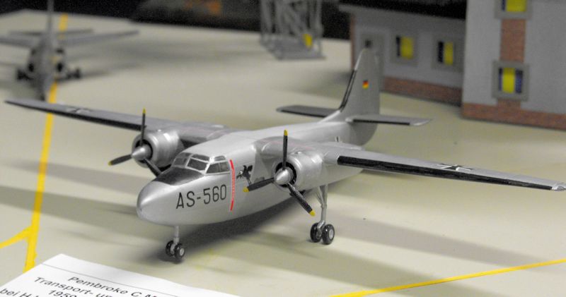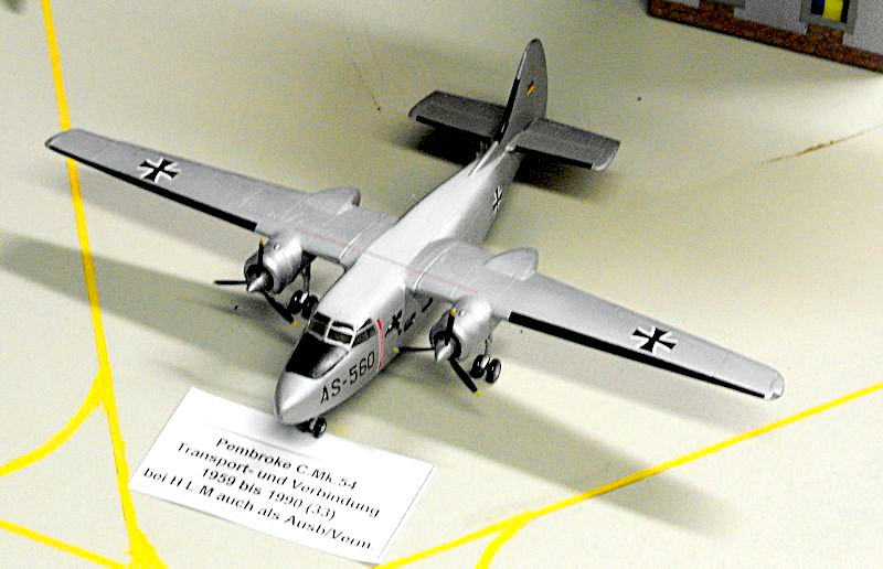 Das Vorbild: Die "Pembroke" wurde in 33 Exemplaren von der Luftwaffe als mittleres Transportflugzeug. Sie war ein Zeitgenosse der "Noratlas" und damit zwischen der aus dem 2. WK stammenden C-54 "Dakota" und der "Transall" angesiedelt. In ihrer Dienstzeit von 1956-1975 flog sie als Transport- und Verbindungsflugzeug, in der Flugvermessung und der Ausbildung. Auch bei der Flugbereitschaft des BMVg kamen einige Exemplare mit einer Sonderausstattung für VIP-Einsätze zum Einsatz. Sie galt zu Recht als ein sicheres Flugzeug, die Luftwaffe verlor lediglich eine Maschine durch Motorschaden, wobei die gesamte Besatzung die folgende Bruchlandung überlebte.