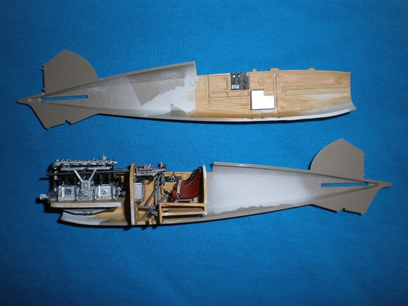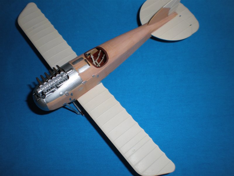Bemalung: Für die Farben verwendete ich wie immer einen Mix aus verschiedenen Farben von Games Workshop (GW-Farben und Sprays von Citadel). Nach dem Zusammenbau der einzelnen Baugruppen wurde zuerst das Innenleben der Maschine mit einem Mix aus Skull White, Bleached Bone und Snakebite Leather bemalt. Die Holzmaserung mit dünnen Streifen Snakebite Leather wurde nur grob angedeutet, dafür kamen nach der Bemalung gleich 2 Schichten Washing mit Gryphonne Sepia zum Einsatz um die Konturen des Cockpits besser hervor zu heben. Das ganze wurde dann noch ganz leicht hell (Codex Grey mit einem Schuss Skull White) gebürstet bevor es dann an den Einbau der Gurte und diverser Kleinteile im Cockpitbereich ging. Im Gegensatz zur dtsch. Albatros D.III ist das Cockpit etwas besser instrumentiert, dafür ist vom Motor noch weniger zu sehen.