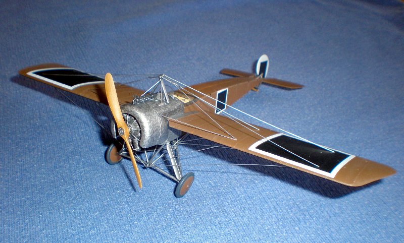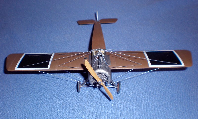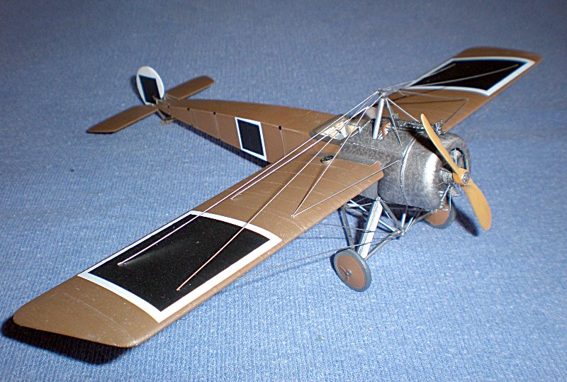 Die letzte Überraschung erlebte ich dann beim Verspannen des Modells – beim Anbringen der unteren Spanndrähte stellte ich fest das die Streben des Hauptfahrwerkes im Weg sind um je einen geraden Draht zwischen 2 Punkten zu befestigen. Doch für nochmalige Änderungen war es zu spät und so zog ich knurrend die Verspannungen mit ca. 1mm Abweichung mit einer leichten Krümmung vor dem Fahrwerk vorbei.