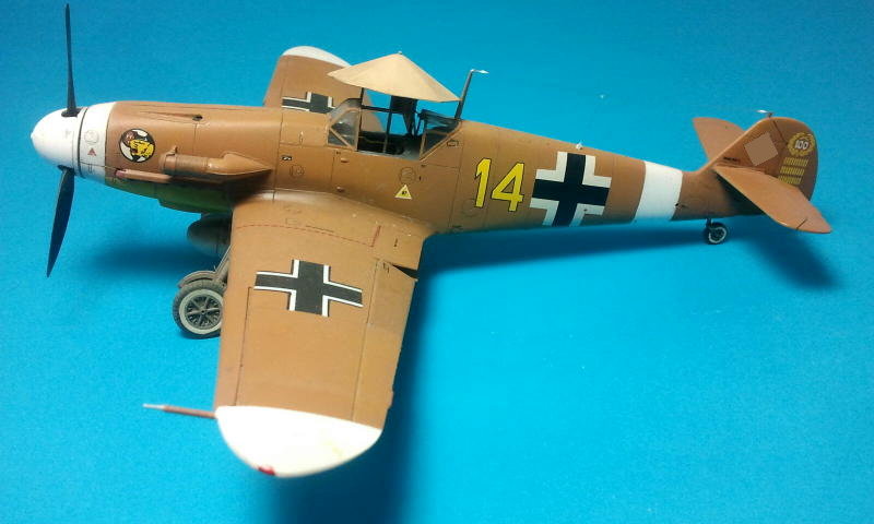 Zur Versiegelung habe ich anschließend alles dreimal im Abstand von ungefähr zehn Minuten mit Future pur übergenebelt. Wie ich aus unerfreulicher eigener Erfahrung weiß, sollte man dabei unbedingt die Bildung von geschlossenen Future-Oberflächen vermeiden, um es nicht zu der gefürchteten Rissbildung kommen zu lassen. Gunzefarbe scheint noch lange nach dem Trocknen zu „arbeiten“ und sprengt dabei wohl eine geschlossen aufgetragene und bereits gehärtete Future-Schicht. Nachdem die Decals problemlos aufgebracht waren, wurde alles mit Gunze H20 Flat Clear überzogen. Sehr gut finde ich übrigens die Idee, die weißen Reifenschultern des Fahrwerks mit Decals darzustellen, das erspart eine Menge fummeliges Abkleben! Dann verwendete ich einen Silberstift, um rund um das Cockpit und die Motorhaube kleine Lackabplatzer anzudeuten. Wie beim Verschmutzen hielt ich mich auch hier zurück, da ich davon ausging, dass die Maschine des „Stern von Afrika“ stets in Top-Zustand gehalten wurde.