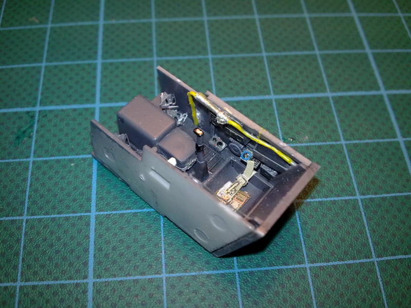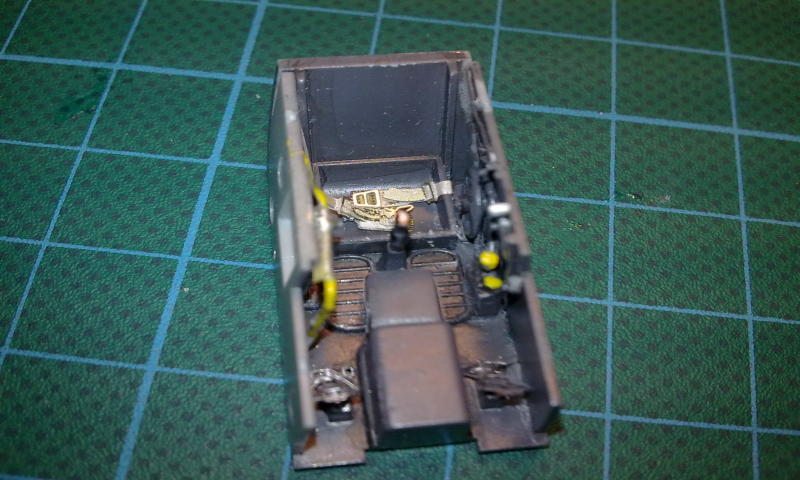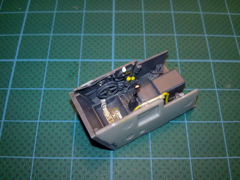 Alle großen Teile ließen sich ohne nennenswerte Probleme mit wenig Spachtel zusammenfügen, so dass der Bau problemlos verlief. Die Eduard Ätzteile ließen sich gut verarbeiten und werten das Cockpit, besonders das Instrumentenbrett m.E. sehr auf. Auch die Gurte machen sich sehr positiv bemerkbar und ihre Befestigung war nach zurechtbiegen vor dem Kleben und Befestigung mit elastischem CA-Kleber kein Problem. Der Innenraum wurde mit Gunze H416 RLM 66 gesprüht und mit schwarz-brauner Ölfarbe vertieft. Anschließend erhielten die erhabenen Strukturen noch ein Drybrush mit Hellgrau. Die Knöpfe und Schalter wurden mit Vallejo-Farben gepinselt. Die Haltegriffe an der Windschutzscheibe und das Haubenkabel entstanden scratch aus Ätzteilresten und Draht.