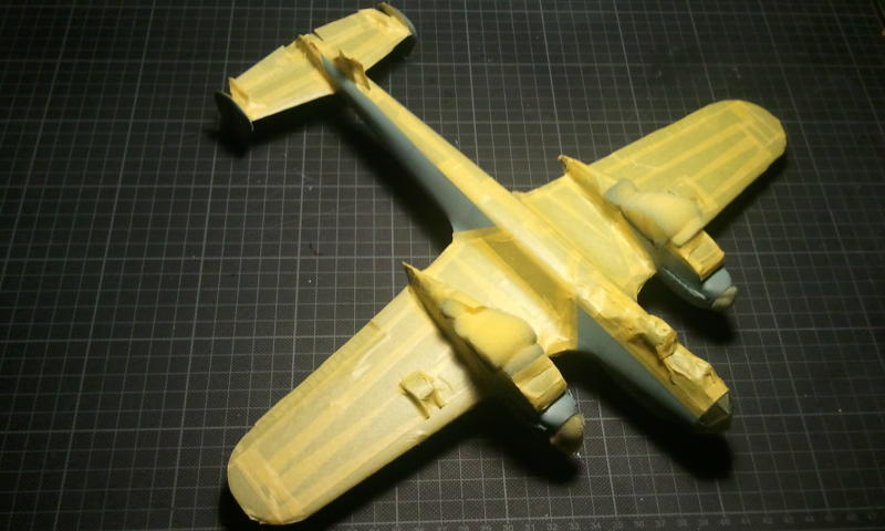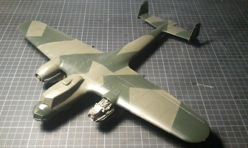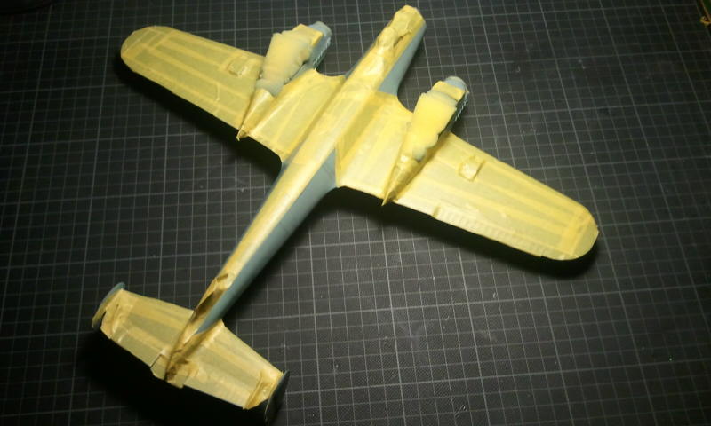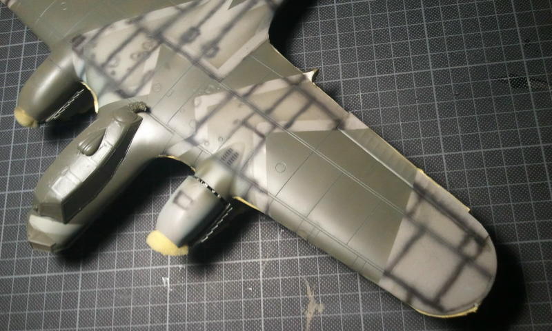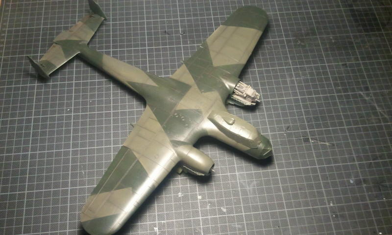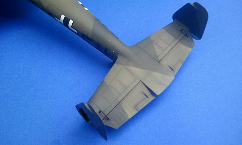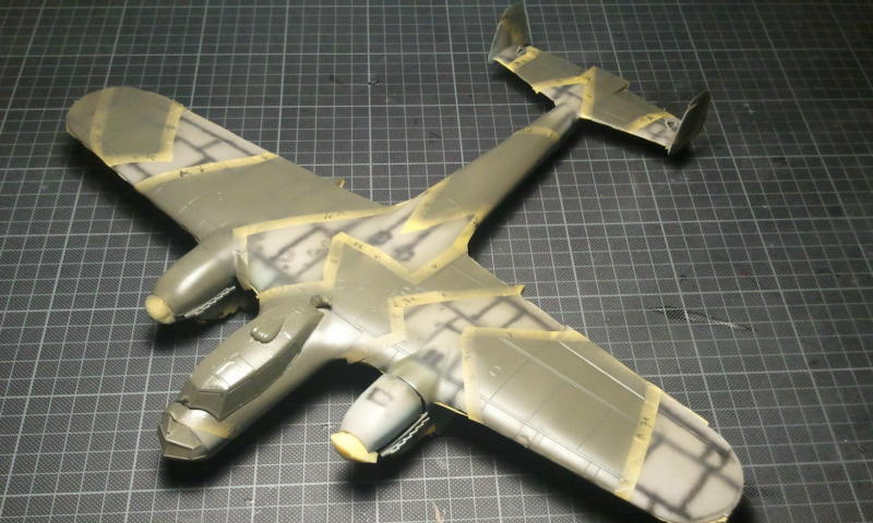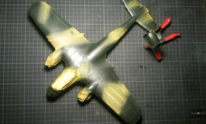 Wenn alles trocken ist, wird die ganze Unterseite abgeklebt. Dann umrahme ich mit Tamya-Band auf der Oberseite die Bereiche der Splittertarnung, die als nächstes RLM 71 Dunkelgrün erhalten sollen und nach Trocknung klebe ich diese für den Auftrag von RLM 70 Schwarzgrün ab. Sinn des Ganzen ist wie gesagt, nicht zwei Schichten Farbe übereinander zu haben. Nach Entfernung von dicken Knäueln von Tamiyaband sind zwar noch ein paar Stellen zu reparieren, aber dann sieht alles ganz zufriedenstellend aus.