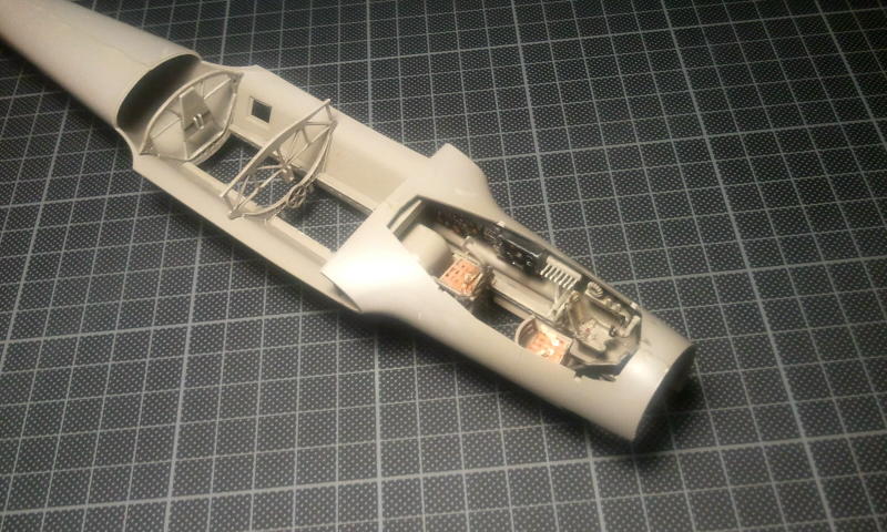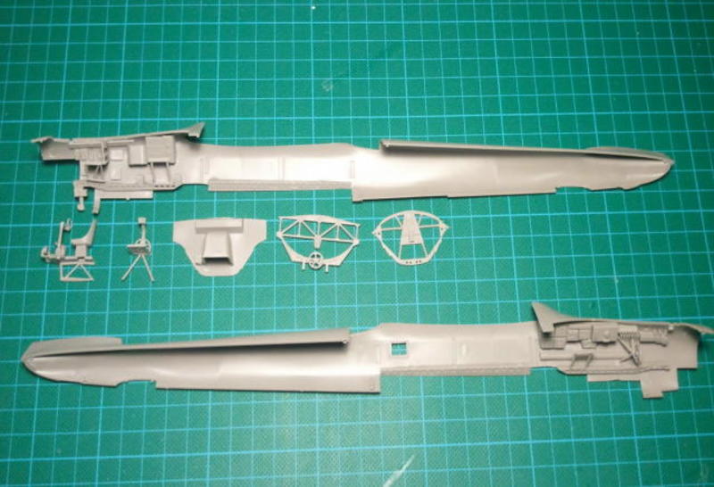 Die Rumpfhälften passen gut zusammen und die Einbauten stören nicht beim Verkleben. Beinahe hätte ich aber den einteiligen Spornrad-Einsatz vergessen. Zwar ist die Felge mit Ihren feinen Speichen wunderbar nachempfunden, aber ich hätte lieber ein realistischeres dreiteiliges Set gesehen, das auch leichter zu bemalen wäre.