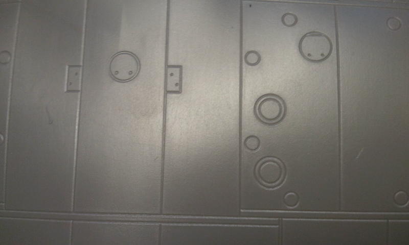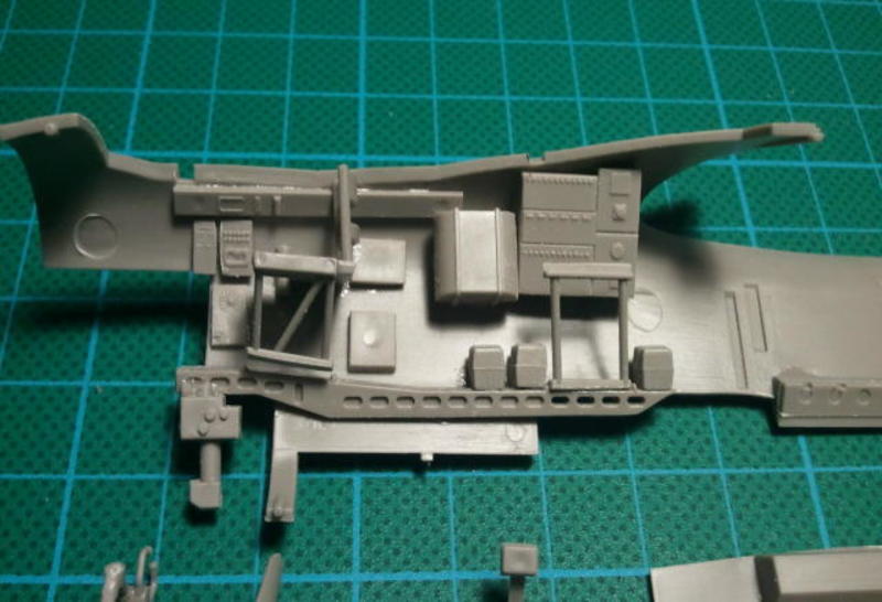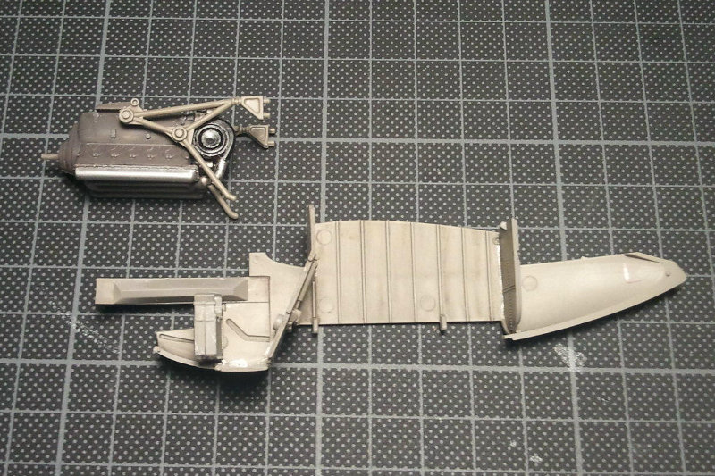 Nach kurzem Antrocknen kann überschüssiger Spachtel außerdem mit Verdünner abgewischt werden. So weit so gut, die größere Arbeit kommt beim Nachgravieren, was besonders an den ausgeprägten Wölbungen dieses Typs und den bereits erwähnten breiten Gravuren liegt. Teilweise habe ich Gravuren mit der Kante einer feinen Dreikantfeile nachgezogen, um die erforderliche Breite zu erreichen. Um alles auf Fehler zu überprüfen, airbrushe ich gern einen hellen Grauton auf die fraglichen Stellen, in diesem Fall bot sich RLM 02 an. Nachdem sich der Tank im Bombenschacht bei diesen Arbeiten bereits zweimal selbständig gemacht hat, habe ich beschlossen ihn ganz auszubauen und den Bombenschacht mit den beiliegenden geschlossenen Klappen endgültig zu verschließen.