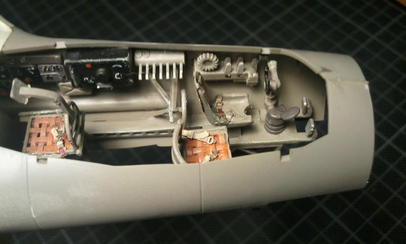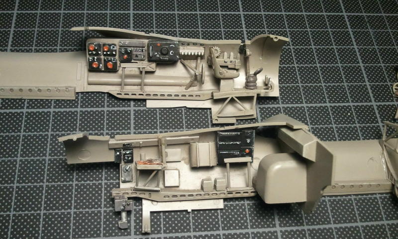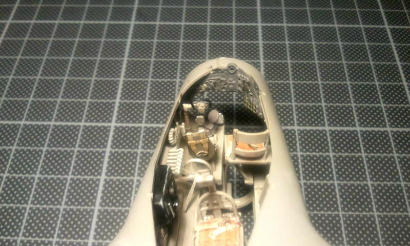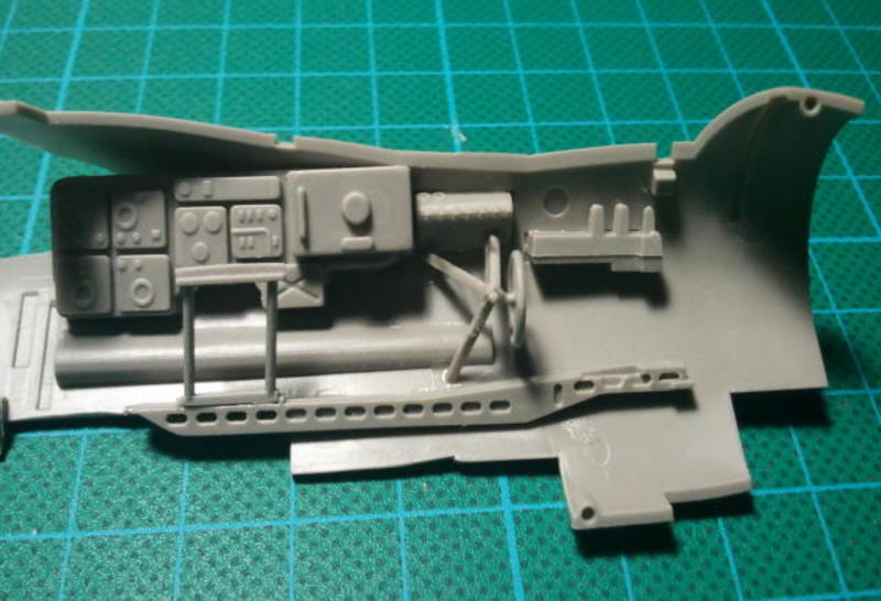 Das Instrumentenbrett erhielt seine Decals, die sich leider überhaupt nicht an die erhabenen Details anpassen wollten. Hätte ich eigentlich auch wissen können. Wer die Nassschiebebilder verwenden will, muss vorher die Instrumentenbretter glattschleifen. Die winzigen Instrumente einzeln auszustanzen, halte ich für fast unmöglich. Unmöglich ist auch der Pilotensitz, der vom Format her zum Massstab 1:72 nicht zu 1:48. Ich war versucht, ihn durch einen größeren zu ersetzen, fand aber nichts passendes und beließ es schließlich dabei.