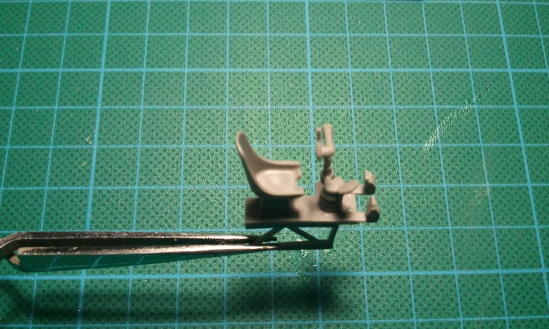Nachdem alles gut durchgetrocknet war, kam die Airbrush zum Zuge und alles erhielt erstmal einen Überzug mit Gunze RLM 02. Man muss schon genau hinsehen, um den blanken Kunststoff von den lackierten Stellen unterscheiden zu können. Die Details wurden mit Vallejo Model Color mit dem Pinsel bemalt, für mich z.Z. die beste Pinselfarbe. Die geflochtenen Sitzflächen erhielten einen Braunton, da ich annahm, dass sie im Original ungefärbt waren. Man beachte auf den Fotos den Größen- bzw. Breitenunterschied zwischen den Sitzen des Funkers und des Beobachters zum Pilotensitz. Da passt noch nicht mal ein Fallschirm rein! Hat jemand zufällig einen Original-Cockpit-Grundriss, den man ICM schicken könnte?