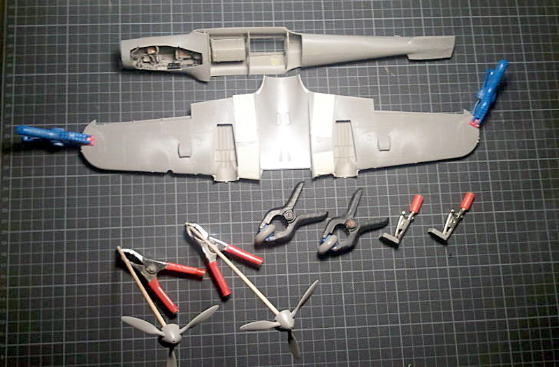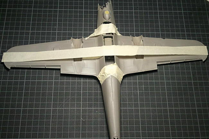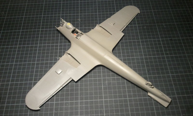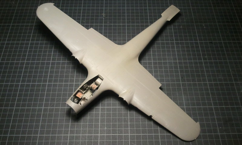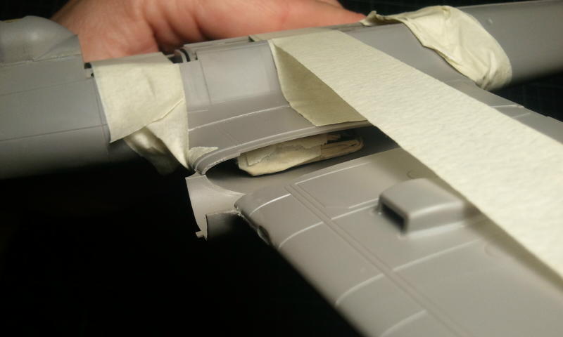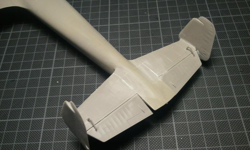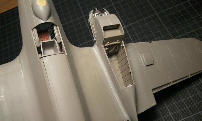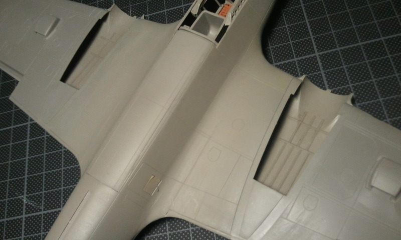 Trotz der guten Qualität des Bausatzes und viel Trockenpassung gibt es - vermutlich verursacht durch meine Ungeschicklichkeit - viel zu Verspachteln, insbesondere der obere Rumpf-Flügelübergang hinter der Kabinenhaube wollte einfach nicht passen, so dass eine große Stufe zu beseitigen ist. Mit Sekundenkleber und Beschleuniger-Spray ist das aber in einer Sitzung erledigt. Wo die Klebestellen auf Blechstöße treffen, verwende ich gern Symprop Schnellspachtel, der sich mit Gunze-Acryl-Verdünnung zu jeder gewünschte Konsistenz verdünnen lässt und ein Füllen bei gleichzeitigem Erhalt der Gravur ermöglicht.