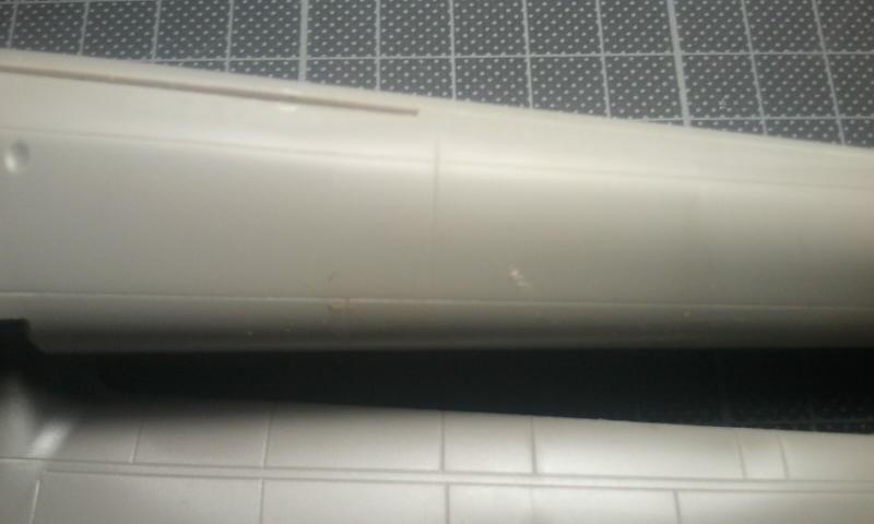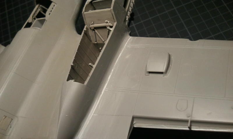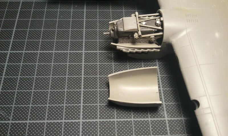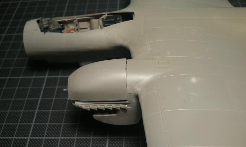 Eine kleine Stufe zwischen Flügel und Motorgondel im Bereich des Hinterendes der Motorhaube muss verschliffen werden, wodurch allerdings die Motorhaube ein wenig zu kurz wird. Da ich diese Motorhaube eh geöffnet lassen will ist das kein größeres Problem, aber ich muss beim Bau der anderen Motogondel besonders darauf achten. Ursache ist wahrscheinlich meine Schlampigkeit, wenn nicht sollte man statt wie ich unten zu schleifen lieber den oberen Bogen etwas auffüttern.