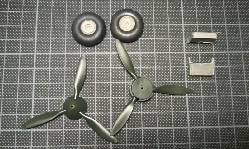 Trotzdem – der Bau muss weitergehen und so habe ich als nächstes die Propeller mit den Spinnern und die Radhälften verklebt. Eduard bietet auf seinem Maskierfolienbogen auch Masken für die Felgen, so dass das anschließende Lackieren der Reifen mit Gunze Tire-Black einfach ist. Propeller und Spinner erhalten einen einheitlichen Farbauftrag mit Gunze RLM 70 Schwarzgrün.