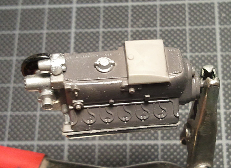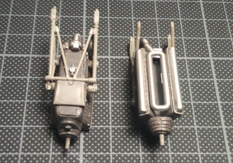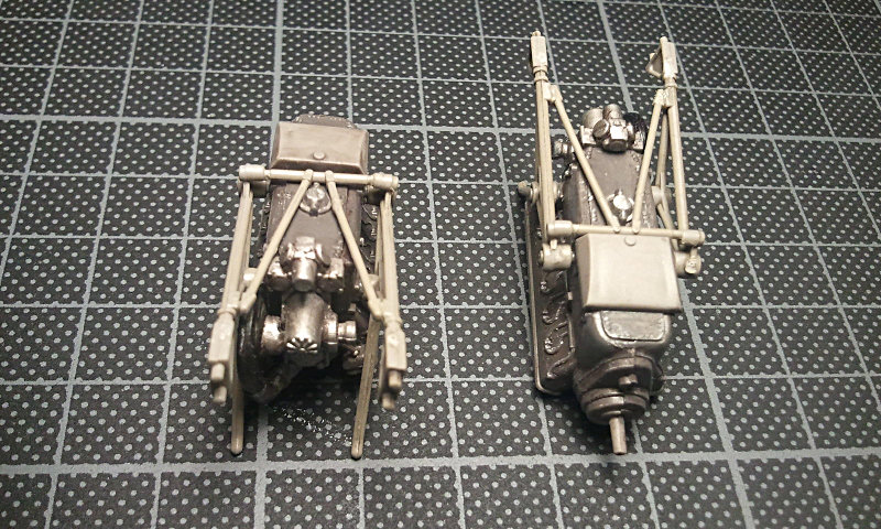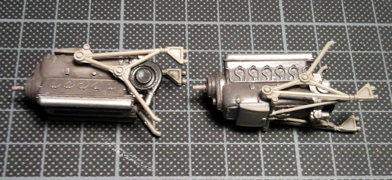 Die DB 601A-Motoren setzen sich aus jeweils neun Teilen zusammen, passen aber trotz des komplexen Aufbaus hervorragend zusammen. Für den Motorblock schlägt ICM RLM Grau 66 vor, ich hätte mehr zu Schwarz tendiert, richte mich hier aber nach den Angaben des Kit-Herstellers. Die Zylinderkopfabdeckungen und die Ladeluftleitung sollen aluminiumfarben werden, daher verwende ich Gunze Super Metallic Superfine Silver. Das hintere Gehäuse mit den Hilfsaggregaten soll stahlfarben lackiert werden, auch hier kommt Gunze Super Metallic, diesmal Farbton Steel zum Einsatz. Letztlich bleibt noch das Gehäuse des Radialverdichters, das ich in Glanzschwarz lackiert habe. Zum Schluss wird alles mit MIG-Dark-Wash gealtert und mit grauem und silbernem Stift etwas gechipt. Sieht alles in allem recht gut aus, meinen nächsten Daimler-Benz-Motor werde ich aber trotzdem lieber in Schwarz lackieren.