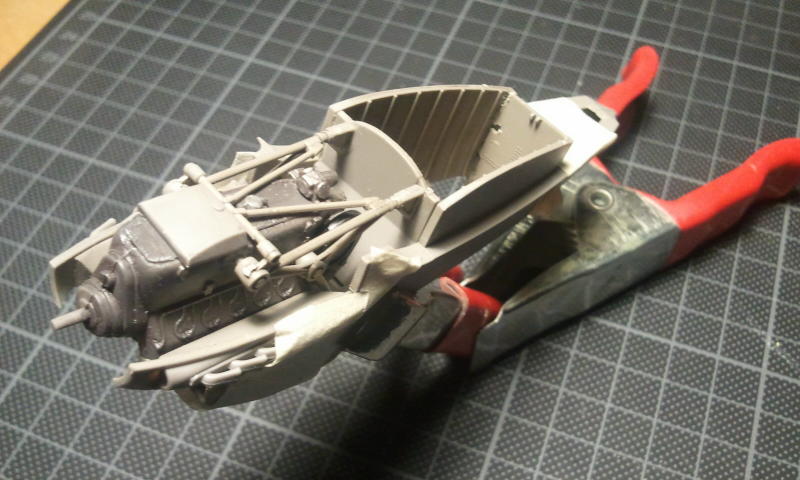 Apropos Motorhaube, diese reitet bei mir auf dem Motor auf und schließt nicht richtig ab. Der Motor sitzt aber völlig korrekt und kann auch nicht tiefer in der Motorgondel platziert werden. Ich denke, die Motorträger-Streben stehen seitlich zu weit vor, ob dies ein Montagefehler meinerseits ist oder ein Konstruktionsfehler weiß ich nicht zu sagen. Ich werde bei der Steuerbordgondel Abhilfe schaffen, indem ich die Träger schmaler feile und dann wie geplant die Motorhaube geschlossen verklebe. Da die Haube sowieso für ein gewölbtes Blech zu massiv wirkt, könnte man sie eventuell etwas dünner schleifen und damit auch den Sitz über dem Motor verbessern. Vielleicht kann man sie aber auch irgendwann durch ein realistischeres dünnes Resinteil vom Zubehörmarkt ersetzen?