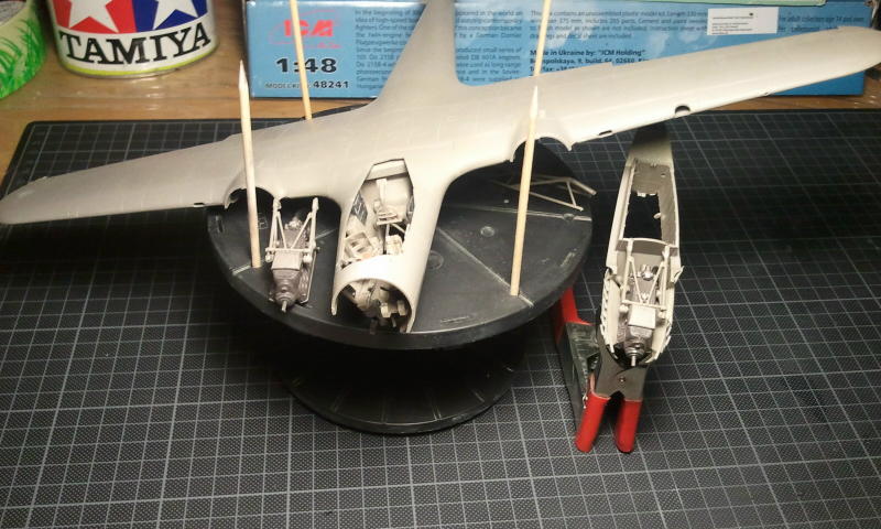 Obwohl man dem Bausatz definitv keine schlechte Passform vorwerfen kann, zeigen die Fotos doch, dass das Zusammensetzen der großen Bauteile einiges an Anpassung und Fixieren mit viel Klebeband erfordert. Die Flügelunterseiten müssen bis zum Trocknen mit Pflöcken aus Pappe angehoben werden, damit sie an die Flügelwurzeln am Rumpf passen. Einiges an Füllen und Schleifen kommt sicher dennoch auf mich zu. Aber zunächst müssen die Klebungen erstmal härten. In der Zwischenzeit widme ich mich den Fahrwerken und den Motorgondeln.