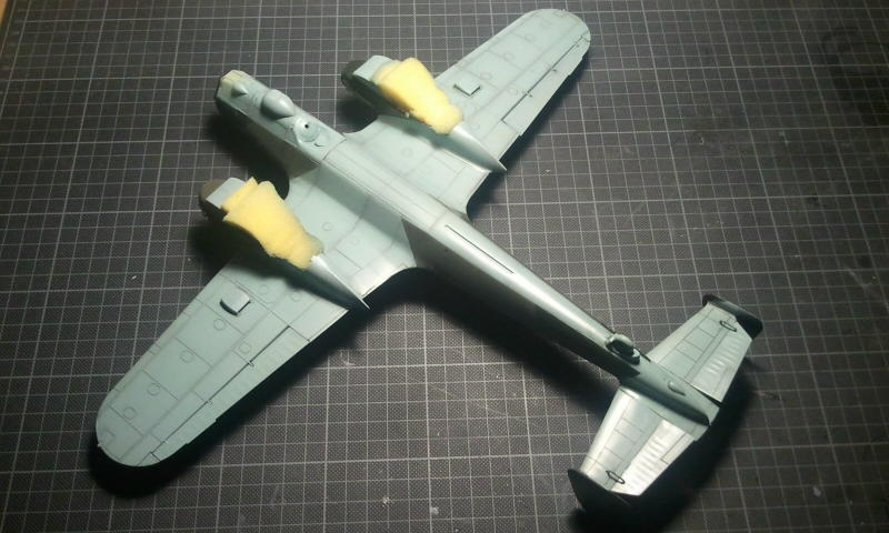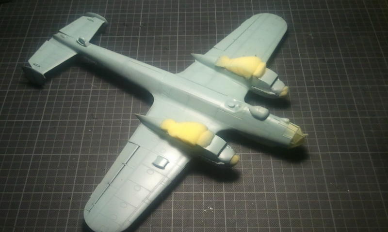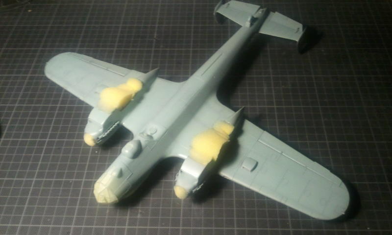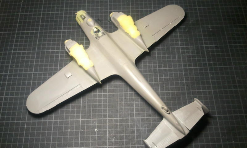 Leider stimmen die Wölbungen der Motorgondeln am Übergang zum Flügel nicht mit denen der Flügel selbst überein. Hier helfen in den Flügel eingesetzte Spreizer aus Gießast, die Wölbung des Flügels zu erhöhen, so dass dann alles gut zusammen passt. Etwas Symprop-Schnellspachtel verdünnt mit Gunze-Verdünner wird in die dennoch verbliebenen Spalten laufen gelassen und nach dem Durchtrocknen mit Verdünner geglättet.