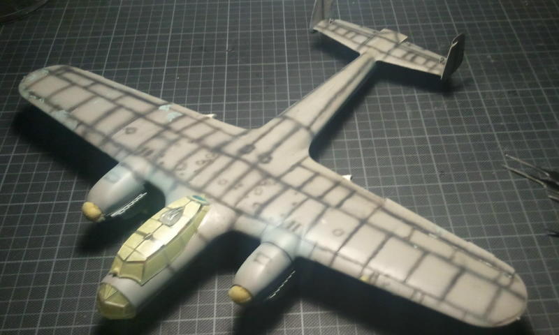 Um der Farbgebung Tiefe zu verleihen, mache ich gern ein Preshading, bei hellen Tarnungen mit Dunkelgrau oder Braun, bei dunklen Tönen mit Schwarz. Für diesen Bau entschied ich mich für stark verdünntes Gunze Mattschwarz, das also entlang den Gravuren und in Winkel und innenliegende Bereichen aufgetragen wird. Nach einer Nacht Trocknung wird dann die Unterseitentarnung in Gunze RLM 65 Hellblau vorsichtig in dünnen Schichten aufgetragen, um ein Überdecken des Preshadings zu verhindern…