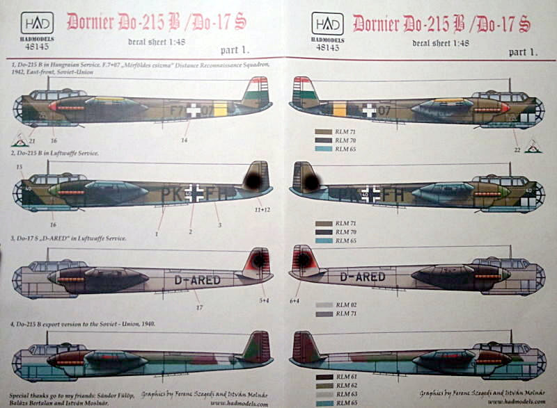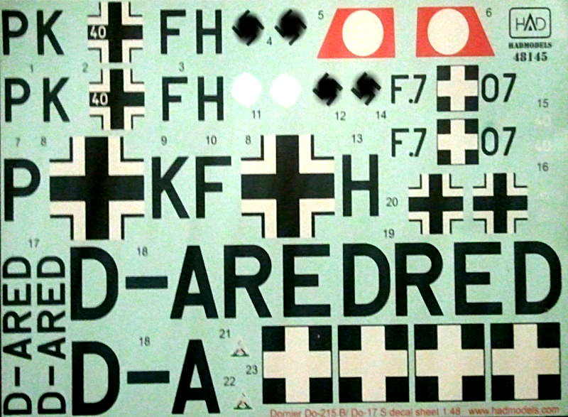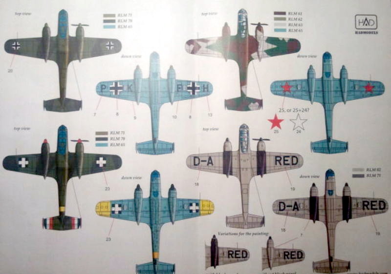 Hannants hat nun die neuerschienenen Decals von HAD (HungAeroDecals) geschickt, für 15 Euro plus Versand kein billiges Vergnügen. Der Bogen bietet Abzeichen für eine farbenfrohe ungarische Maschine in 70/71/65, eine sowjetische Exportversion mit (angeblich) nichts als zwei riesigen Sowjetsternen und zwei deutsche Flugzeuge. Eines davon ganz in RLM 02 und mit der zivilen Kennung D-ARED, eines in RLM 70/71/65 und mit den taktischen Kennzeichen PK+FH. Beide werden nur mit "in Luftwaffe Service" beschrieben, weitere Angaben fehlen. Was ebenfalls gänzlich fehlt, sind Wartungshinweise. Da ich denen des Kits nicht traue, habe ich letztlich ganz drauf verzichtet. Ich hoffe, dass sich in Zukunft noch andere Decalhersteller dieses sehr guten Bausatzes annehmen, um dem Modellbauer Abzeichen zu bieten, die der Qualität des Kits ebenbürtig sind. Sicher wird die ICM B-5 Nachtjäger-Version in der geplanten Auflage von Revell mit guten Decals ausgerüstet sein und vielleicht nimmt sich der deutsche Hersteller später auch der B-4-Version an?