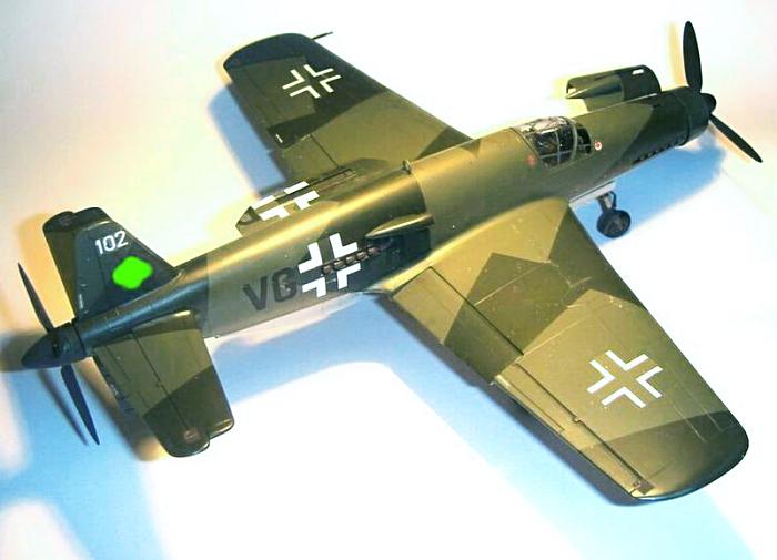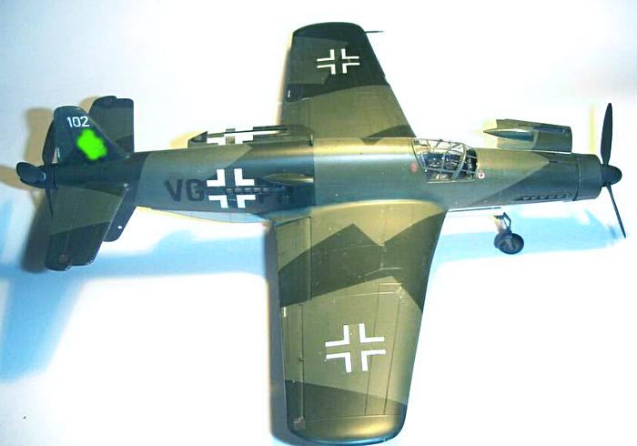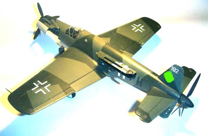 Die Bemalung fand wie immer mit Gunze Aequous Colours und Aibrush (Badger 150) statt: Innenräume mit RLM 66 (10 ml H32 mit 1 ml H12), die Motoren mit verschiedenen Grautönen (RLM 02/H70, RLM 22/H77, RLM 63/H308), die Unterseiten mit RLM 76 (H417), die Oberseiten mit RLM 70/71 (H65/64). Dabei ist zu beachten, dass die „102“ im hinteren Bereich ab Vorderkante der hinteren Motorhaube ein inverses Tarnschema hatte, d.h. RLM 70 und 71 waren vertauscht. (Vielleicht wurde hier der hintere Rumpf von einem anderen Zulieferer als der vordere verwendet oder es wurde nach einem Bruch ein Hinterrumpf von einer anderen Maschine angebaut??) Die Positionsleuchten wurden mit Tamiya X27 Clear Red (backbord) bzw. X25 Clear Green (steuerbord) eingefärbt. Nach dem Überzug des Modells mit H30 klar glänzend und einer Woche Trocknungszeit wurde ein leichtes Washing mit Plaka-Brühe graubraun plus etwas Auto-Scheibenreiniger durchgeführt und nach Anbringung der Markierungen alles mit Seidenmatt-Klarlack versiegelt (10 ml H20 mit 1 ml H30).