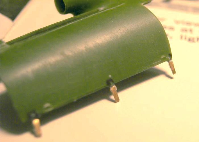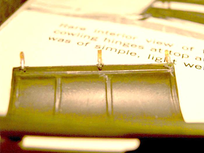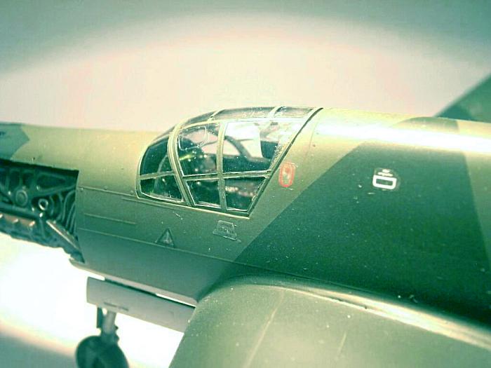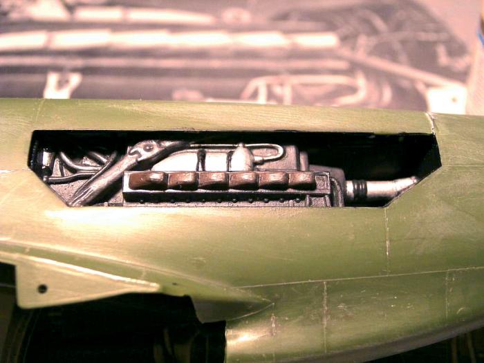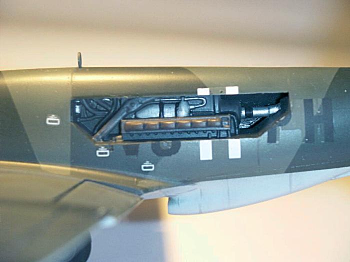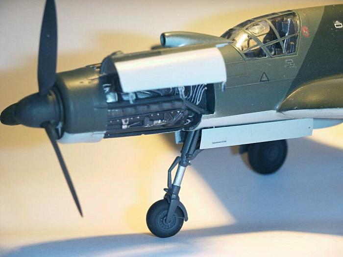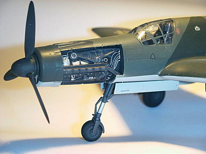 Die vordere Motorhaube habe ich verfeinert, indem ich den Ladereingang von innen aufgebohrt und eine Stützstange angebracht habe (Stahldraht 0,4 mm). Die Verschlüsse wurden aus Stahldraht und Ätzteilresten nachgebaut und zum Schluss mit einem Fineliner mit Details versehen. Auch die hintere Motorhaube erhielt Verschlüsse und eine Stütze. Der Kotflügel des Bugfahrwerkes wurde mit dem Proxxon ausgedünnt und mit zwei Streben aus Draht versehen. Beide Motorhauben und die Fahrwerksklappen des Bugfahrwerkes wurden zur sicheren Fixierung mit Drahtstiften versehen, die in entsprechende Bohrungen im Rumpf passen, die Motorhauben wurden zwecks schadensfreiem Transport nur angesteckt.