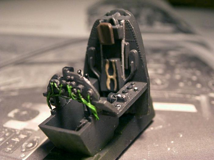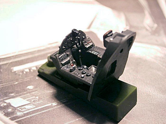 Das Modell von Monogram hat rund 30 Jahre auf dem Buckel, und das sieht man ihm auch an: dunkelgrünes, relativ hartes Plastik mit sauberen erhabenen Oberflächendetails, einigem an Grat und Versatz, und schöne klare Kabinenteile. Highlights stellen die reliefartig dargestellten Motoren und die schönen Details im Cockpit und Bugradschacht sowie beweglich zu montierende Landeklappen dar. Man hat die Wahl, die ein- oder zweisitzige Variante zu bauen, für letztere liegen das zweite Cockpit, Antennen und der gewölbte Rumpfrücken als Extrateile bei. Da ich die A-0 „102“ bauen wollte, wanderten die Zusatzteile in die Grabbelkiste.