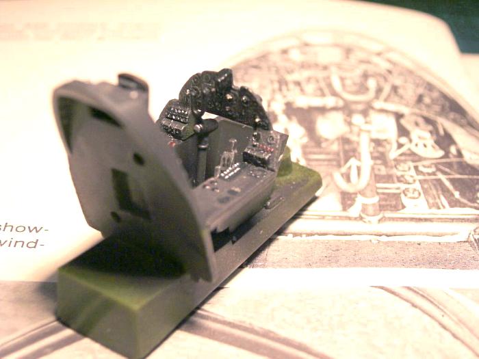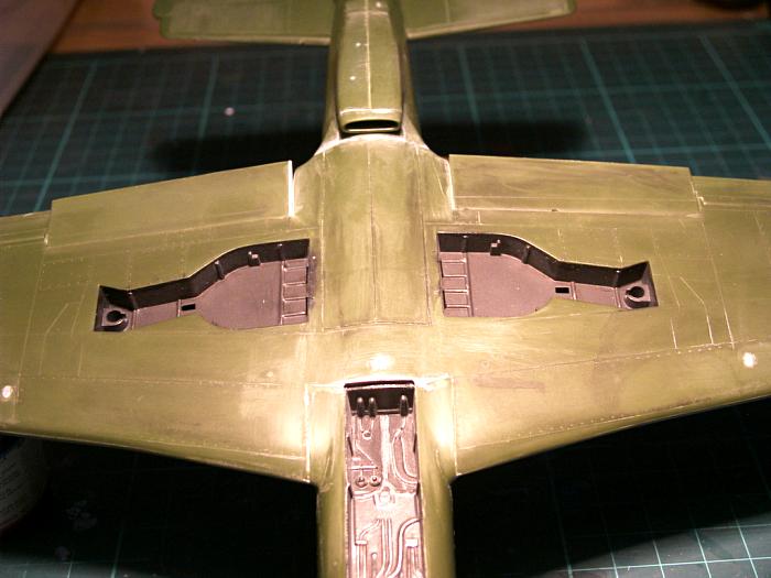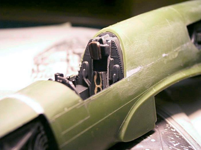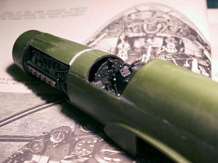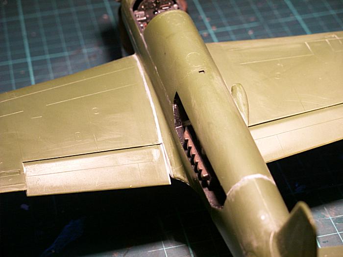 Das Instrumentenbrett versah ich mit Instrumenten-Rückseiten aus Rundmaterial-Abschnitten, in die 0,4 mm-Draht eingeklebt wurde. Damit die Kabinenhaube sitzt, muss oben am Sitz etwas Material entfernt werden. Um den Rumpfrücken gut mit den Rumpfhälften zu verbinden, habe ich Sheetstreifen verwendet. Im hinteren Bereich sollte man, was ich versäumt habe, etwas dunkle Pappe o.ä. in die Kühlerausgänge kleben, um den „Durchblick“ zu verhindern. Die Propellerachsen müssen nach guter alter Manier mit einem heißen Messer o.ä. abgeflacht werden, um einen sicheren Sitz der Propeller zu gewähren. Alternativ kann man sie natürlich auch festkleben. Im Bereich des Flügel-Rumpf-Überganges klaffen millimeterbreite Spalten, die mit Sheetmaterial und Spachtel verschlossen werden müssen. Die Klappen habe ich fixiert.
