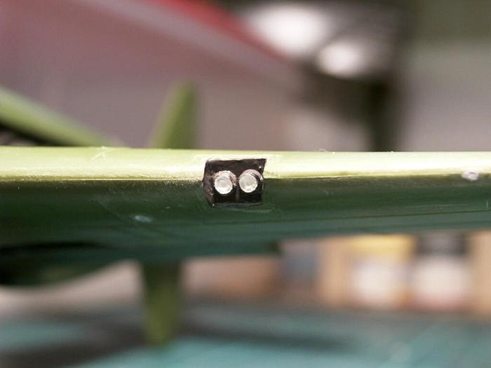 Zur Detaillierung des Landescheinwerfers wurde die Öffnung im Flügel zunächst mit Sheetmaterial verkleidet, dann wurden zwei Scheinwerfer aus Evergreen-Röhrchen-Abschnitten mit ausgestanzter Baremetal-Foil samt Trägerpapier beklebt, mit Klarlack versiegelt und eingesetzt. Das Scheinwerferglas wurde mit dem Bausatzteil als Master neu gezogen und mit verdünntem Weißleim eingeklebt. Die Positionsleuchten wurden ausgefeilt, Klarmaterial eingeklebt, passend zugeschliffen und poliert.