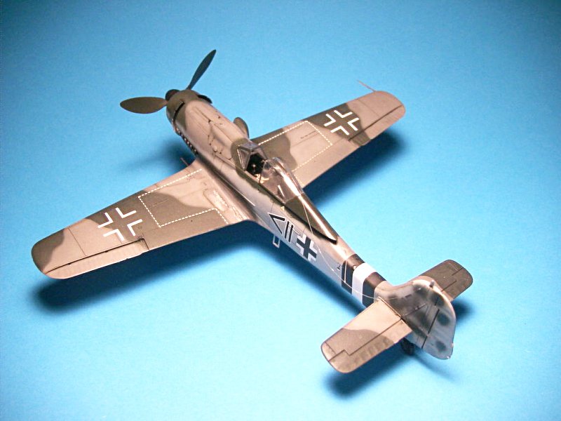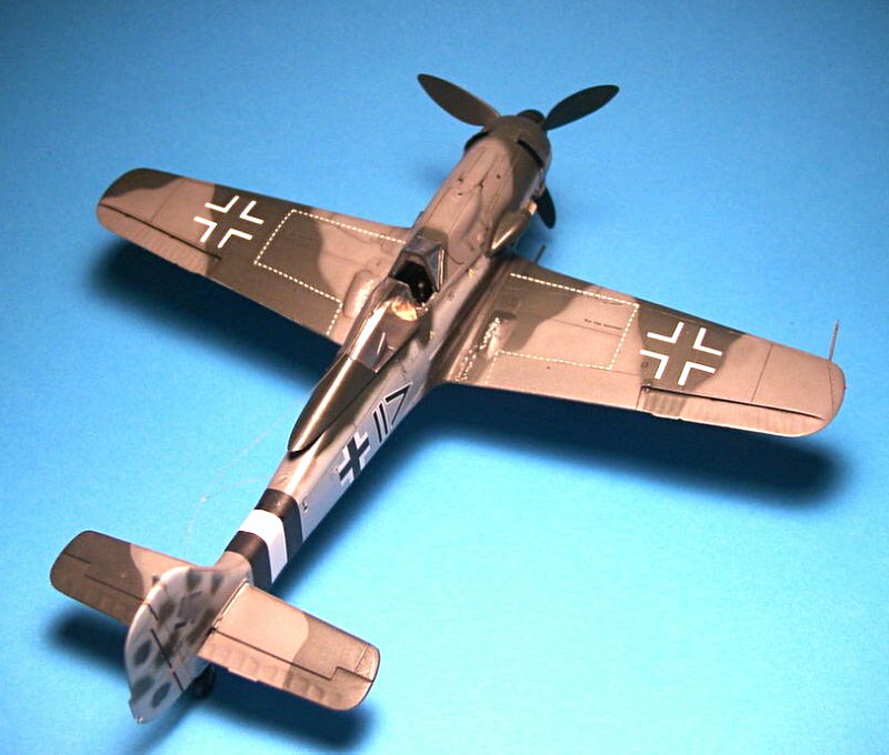 Bei der Bemalung kamen Farben von Gunze Sangyo (Oberseiten RLM Grün 70, Gunze H65, und Grau 74 Gunze H68, Unterseite Grau 76/H417), sowie zur Versiegelung Mattlack von Gunze mit ca. 1/8 Glanzlack gemischt zum Einsatz. Die Übergange zwischen den Farben wurden mittels schwebender Schablonen, die aus den in Originalgröße abgebildeten Tarnschemen der Bauanleitung ausgeschnitten wurden, etwas fließend gehalten. Die Oberseiten-Tarnfarben wurden anschließend mit jeweils 1/10 weiß aufgehellt und damit die Innenflächen der einzelnen Paneele wolkig übergesprüht, so dass ein leicht ausgeblichener Effekt entstand.