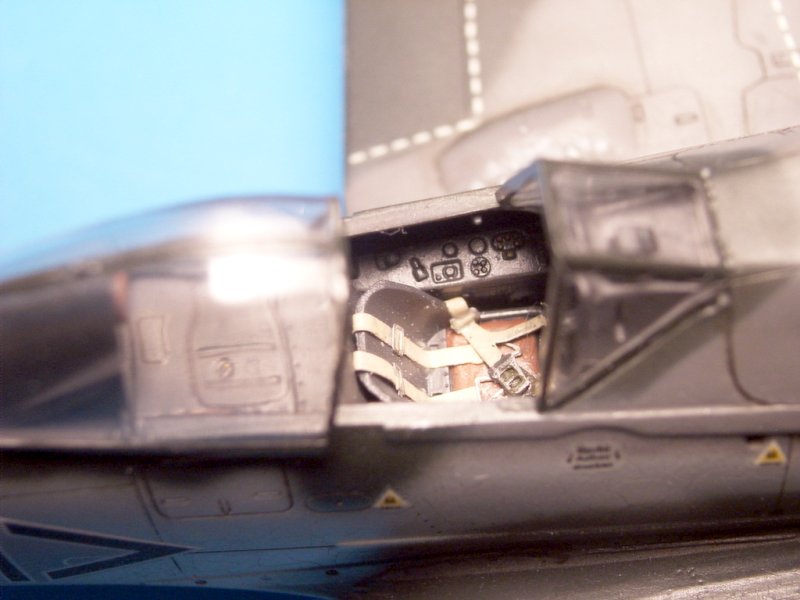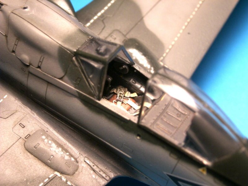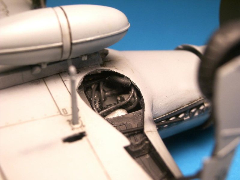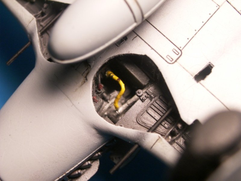 Das Modell wurde im Wesentlichen nach Anleitung gebaut, einzig das Mittelstück zwischen den Fahrwerksausschnitten wurde durch das Resinteil von Model Design Construction ersetzt, was zu einigen Füll- und Schleifarbeiten führte. Die Motornachbildung von MDC baut sich recht einfach, wenn man mal von den sehr vagen Angaben zur Befestigung der Leitungen und Kabel absieht. Das ganze passte sich nach wenigen Anpassungsarbeiten recht gut in den vorderen Rumpfbereich ein.