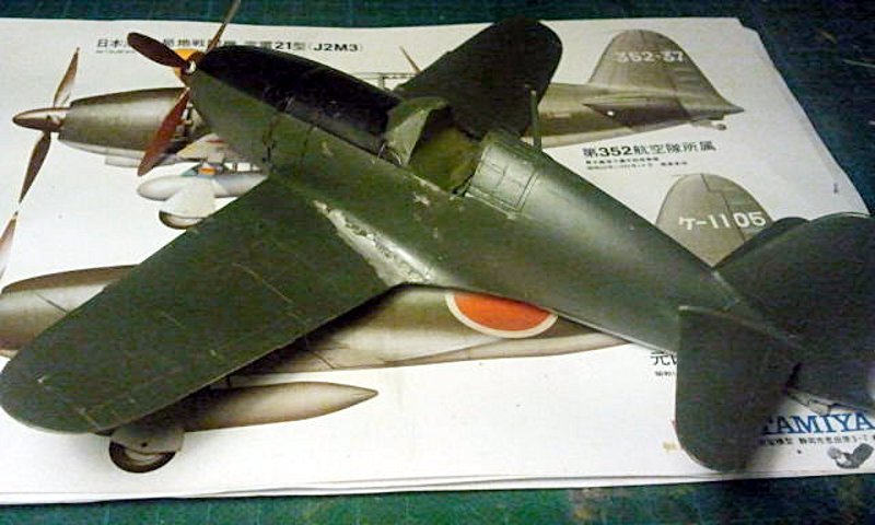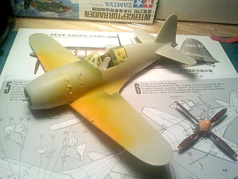 Am lebhaftesten in Erinnerung habe ich diesen Typ durch den alten Revell 1:32er-Kit, den ich allerdings nie gebaut habe und den man heute nur noch Second-Hand bekommt. Außerdem gab es einmal von Otaki eine "Jack" in 1:48. Aktuell hat Hasegawa die Raiden in 1:32 und 1:48 im Sortiment. Mich hat aber der alte Tamiya-Bausatz immer mehr gereizt. Die Formen stammen aus dem Jahr 1973. Zu der Zeit baute ich Airfix-Kits aus weichem hellblauen Plastik, überzogen von erhabenen Gravuren und Panzernieten. Inneneinrichtungen bestanden bestenfalls aus einem Hockbrett auf dem eine arme Pilotenfigur kauerte und, wenn es hochkam noch einem Instrumentenbrett.