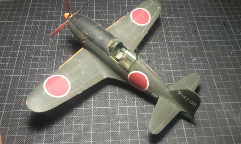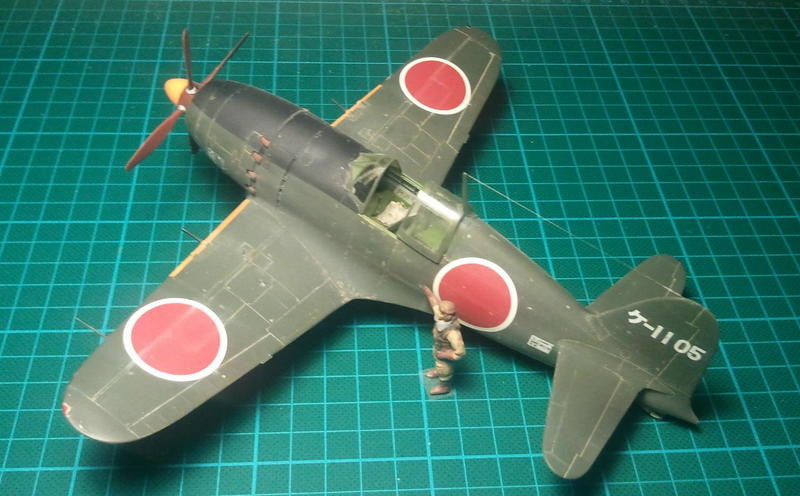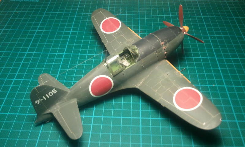 Bei der Raiden (Baubericht siehe hier) war ich vor allem mit der zu stark geratene Darstellung der Abnutzung des Lackes an den Flügelwurzeln unzufrieden. Ich entschied mich für eine Radikalkur und sprühte diesen Bereich komplett neu mit IJA Green von Gunze. Anschließend griff ich auf meine bewährte Chipping-Methode zurück und applizierte dezente Abplatzer mit meinem Silber-Stift. Das helle Washing der Gravuren wurde mit einem passenden Buntstift wieder hergestellt. Da ich beim Thema war, wurden mit Pigment ein wenig mehr Auspufffahne und Korrosionsspuren angebracht.