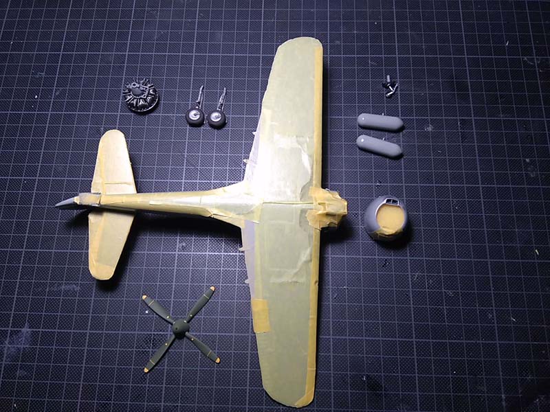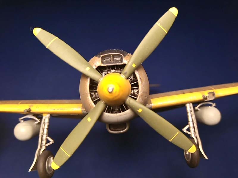 Der Motor ist einteilig, aber fein detailliert. Der Löwenanteil des Antriebes wird von den gut sichtbaren und aus zahlreichen Elementen zusammenzufügenden Getriebe repräsentiert. Sehr gut gelöst ist die Montage der zahlreichen Auspuffrohr-Gruppen. Hier muss man allerdings sehr aufpassen, nichts zu verwechseln und jedem Teil die korrekte Orientierung zu geben. Der Propeller erhält neben der grünen Bemalung zwölf feine gelbe Markierungen, hier zeigt sich die erstaunlich gute Qualität der beiliegenden Decals. Er wird am Ende des Baus einfach in ein Poly Cap im Inneren des Motors eingesteckt. Die Hochzeit von Rumpf und Flügeln ist absolut problemlos, der Spachtel bleibt in der Tube. Genial gelöst ist die Montage der Räder, die drehbar bleiben, so dass später keine Probleme beim korrekten Ausrichten der abgeflachten Reifen zum Boden auftreten. Außerdem spart man sich durch die separaten Felgen das Abkleben beim Bemalen. Sehr erfreulich ist auch die realistische Tiefe der Fahrwerksschächte, die im Übrigen auch mit zahlreichen Rohren und Leitungen versehen sind. Die Flügelkanonen haben realistische Oberflächen-Details, sollten aber unbedingt aufgebohrt werden.