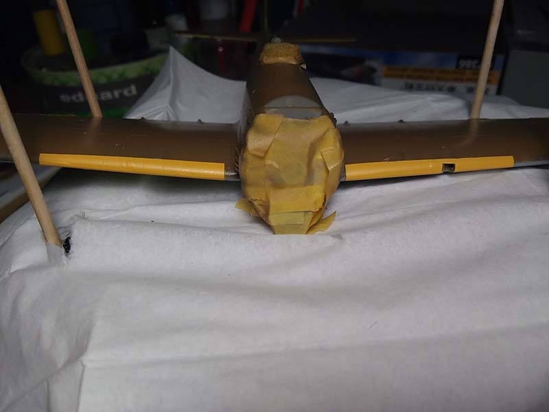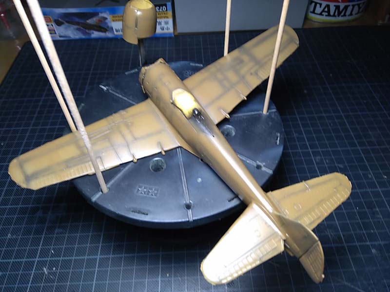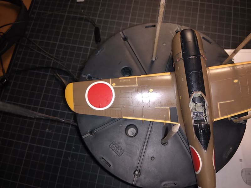 Als Bemalungsvorschläge bietet Hasegawa vier Maschinen der 104. Sentai der IJAAF an, alle in IJA-Dunkelgrün über Hellgrau. Da ich bereits mehrere grün-graue Japaner in der Vitrine habe, entschied ich mich für den braunen Ton einer Maschine des selben Regimentes. Jetzt kam das einzige "Zubehörteil" dieses Baues zum Einsatz, ein Satz Lackiermasken von Eduard (EX060). Zunächst wurden die Bereiche des Rumpfbandes, der Flügel und Leitwerksspitzen in weiß lackiert. Die gelben Bereiche wurde mit einem Gemisch aus Gelb und etwas Rot passend zu den gelben Decals lackiert und anschließend folgte ein Preshading mit Gunze Tire-Black (H77). Für die Unterseite wurde IJN-Gray (H61) von Gunze verwendet, für die Oberseite Gunze Dark Earth (H72). Anschließend wurde mit Future glanzlackiert.