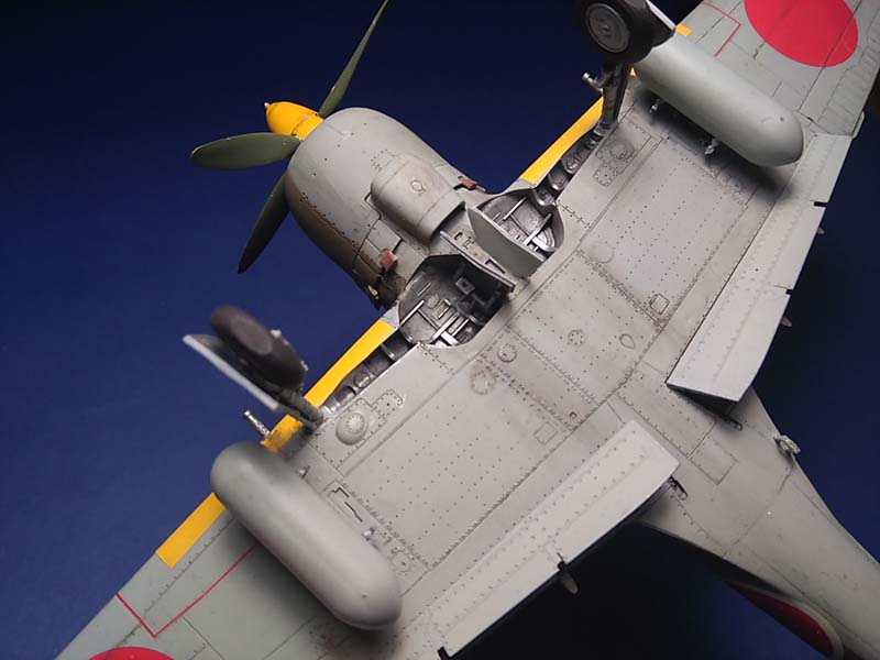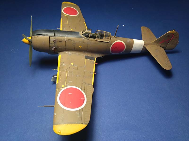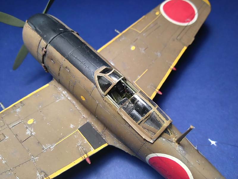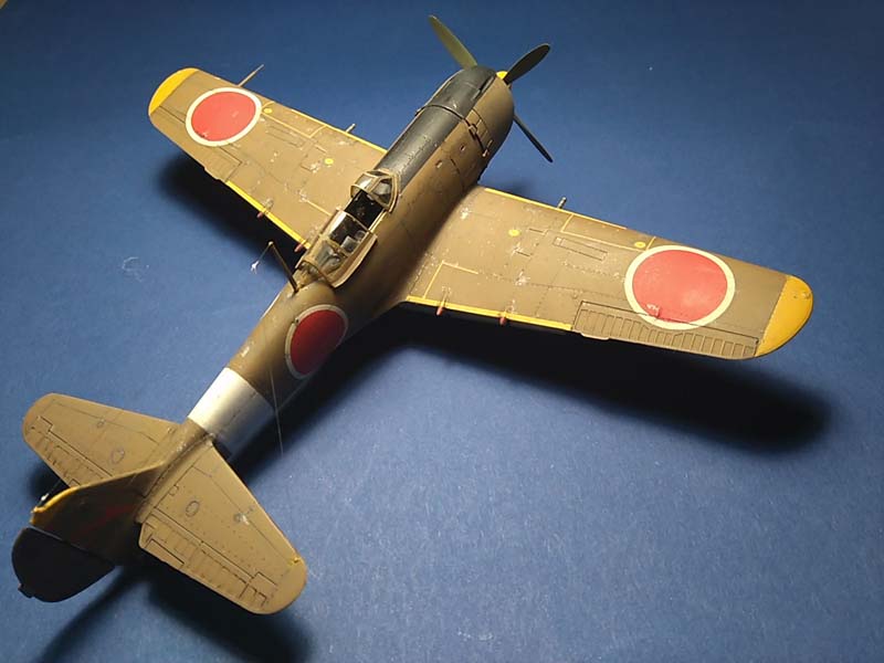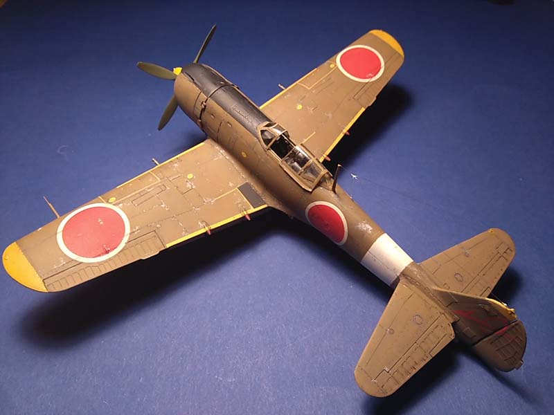 Das Modell stellt eine Ki-84 dar, die von einem Militärarzt auf dem Nakajima-Flugfeld in Ota fotografiert wurde. Es handelt sich vermutlich um eine der vier Reserve-Maschinen der 104. Sentai, die aus der Mandschurei ins Mutterland zurückverlegt worden war. Die gelben Markierungen zeigen eine Maschine der 1. Chutai an, das weiße Rumpfband vermutlich den Chutai-Kommandeur (Quelle: Ferkl, M.)