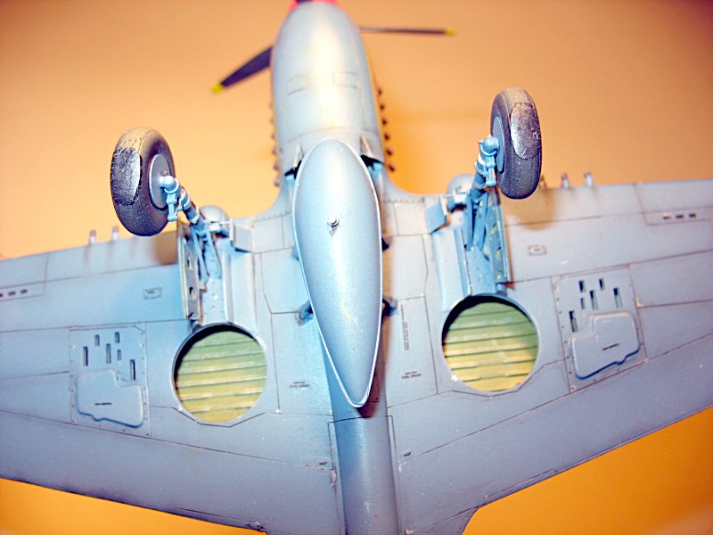 Der Vergaser-Lufteinlauf auf der Motorhaube musste gegen Durchblick abgedichtet werden, unten baute ich den hinteren Teil eines Motors aus einem alten P-40-Bausatzes von Hobbycraft ein, für den Fall, dass dieser durch die Kühlerklappen einsehbar wäre. Er war es nicht, die Aktion hätte ich mir sparen können!. Nächste Baustelle war die Aufhängung des Zusatztankes, bei der die inneren Streben durch Stahldraht ersetzt wurde (Stahl, da dieser nicht so leicht beim Einbau verknickt), Reisenfummelei, bis alles grade war! Dass der Übergang Unterflügel - Rumpf neu aufzubauen war, wurde schon erwähnt. Der Spornradschacht war mir zu einfach dargestellt, also verschloss ich die Öffnung mit Plastikmaterial, formte die Ledermanschette aus Milliput und stellte neue Klappen aus 0,5 mm Plastiksheet her.