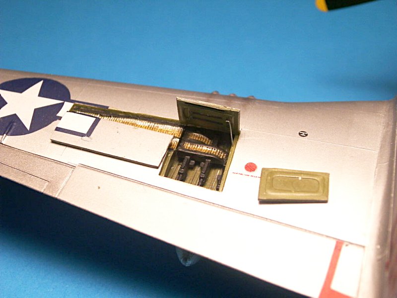 Die Flügeloberseiten der Mustang waren übrigens oft herstellerseits bereits verspachtelt und wurden dann silbern überlackiert, so dass hier keine unterschiedlichen Metalltöne zu erwarten sind, von den Wartungsklappen vielleicht mal abgesehen. Versiegelt wurde mit Metalizer-Sealer, auf dem die Decals gut hafteten. Mein Modell zeigt die Maschine von Lt. Marvin Arthur, 334th Fighter Squadron 4th Fighter Group, U.S. 8th Air Force, stationiert in Debden, England 1944. Als interessante Alternative bietet der Decalbogen von Revell auch noch eine P-51 der Schweizer Luftwaffe an,