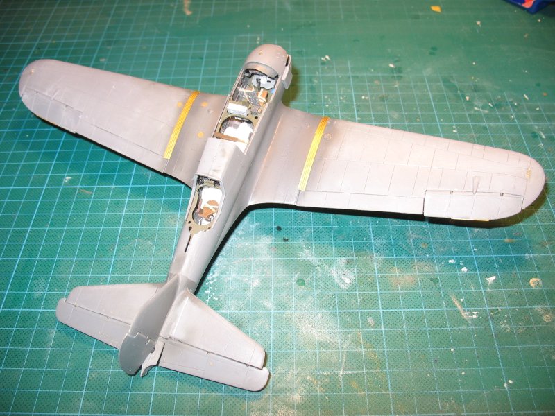 Auf keinen Fall darf man vergessen, die Innenseiten der Höhen- und Seitenleitwerke und der Außenflügel vor dem Zusammenbau auszukehlen, sonst passen die Ruder anschließend nicht! Hier ist mir übrigens ein dummer Fehler unterlaufen, den ich inzwischen korrigiert habe: die Querruder dürfen natürlich nicht beide herabhängen, sondern müssen entweder in neutraler Stellung stehen oder, wenn dann gegenläufig ausgelenkt sein!