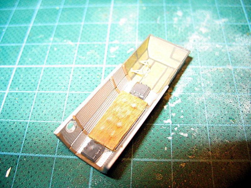 Das Falten der Bodenwanne gestaltet sich recht einfach, wenn man in die Falzlinien etwas Flüssigkleber laufen lässt, und das Teil sofort an die vordere Verglasung anpasst, so dass man die richtige Form erhält.