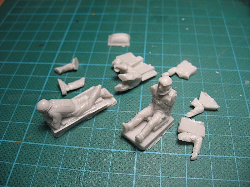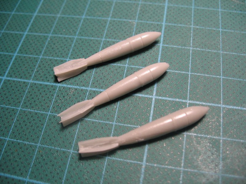 Die Resinteile lassen sich gut von ihren großen Angüssen trennen, sind aber nicht blasenfrei. Ob man die Piloten einbaut ist Ansichtssache, ich habe sie weggelassen, obwohl sie sehr gut detailliert sind. Die aus Resin gefertigten Bomben zeigen gedrehte Leitbleche, was, wie mir glaubhaft versichert wurde, dem Original entspricht. Da meine Bomben jedoch auch noch in sich verzogen waren, habe ich lieber auf sie verzichtet.