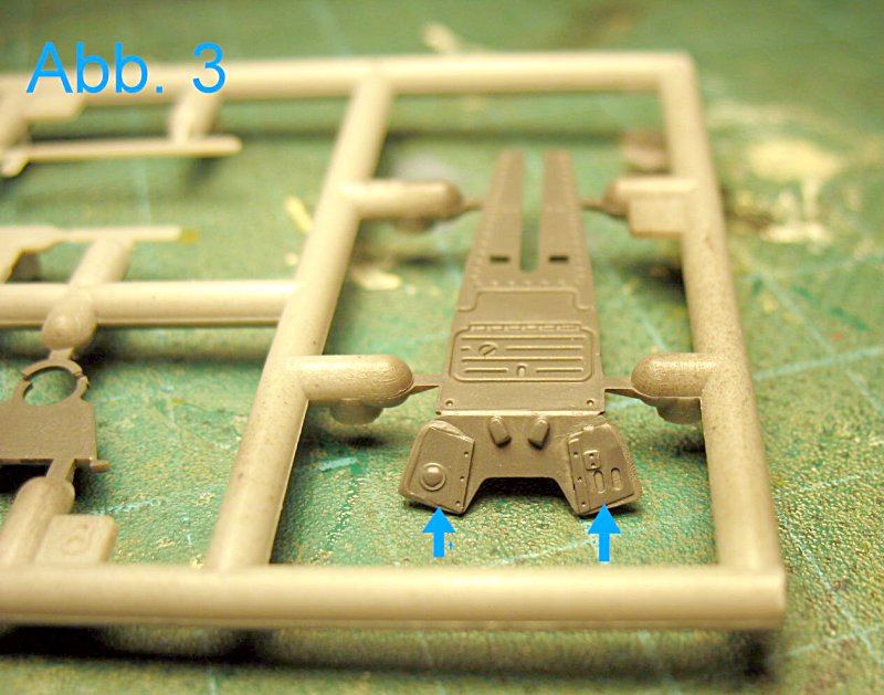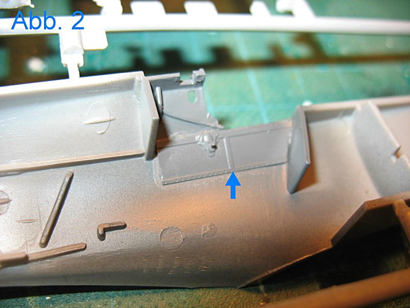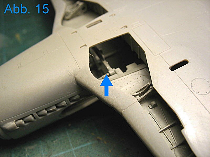 Leider ist bei der Neuauflage des Kits der Jumo 213 E nicht mehr enthalten, so dass im oberen Bereich des Fahrwerksschachtes gähnende Leere herrscht Immerhin soll man den doch vorhandenen Rahmen des Motorlagers einkleben, warum dann nicht auch gleich die beiden Motorträger, die sich auf Rahmen G finden aber als "nicht zu verwenden" markiert sind?? Ich habe es jedenfalls getan und gleich wirkt die Gegend viel weniger wüst (Abb. 15).