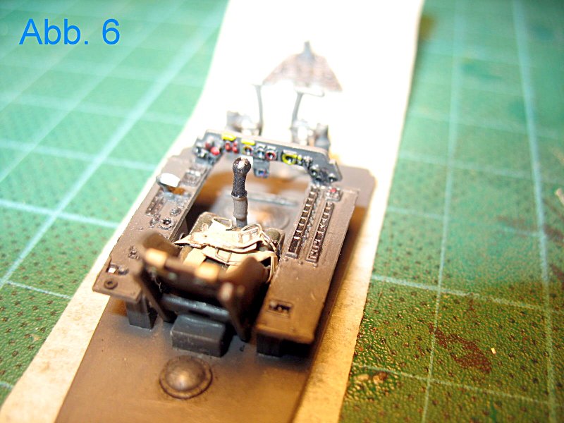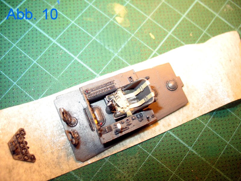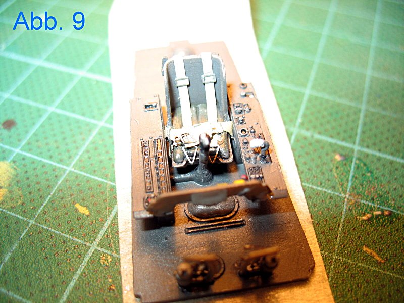 Zusammenbau: Im hervorragenden Cockpit habe ich einzig die Ruderpedale und die Gurte (Abb. 9, 10, 11) und zwei kleine Klappen (Abb.3) sowie Innenverkleidungen (Abb. 2) aus geätztem Metall verwendet. Das Instrumentenbrett erhielt einen zusätzlichen Sauerstoffdruck-Anzeiger und einige kleine Hebel (Abb. 1). Allerdings ist all der Aufwand nach dem Schließen des Rumpfes kaum noch zu sehen!