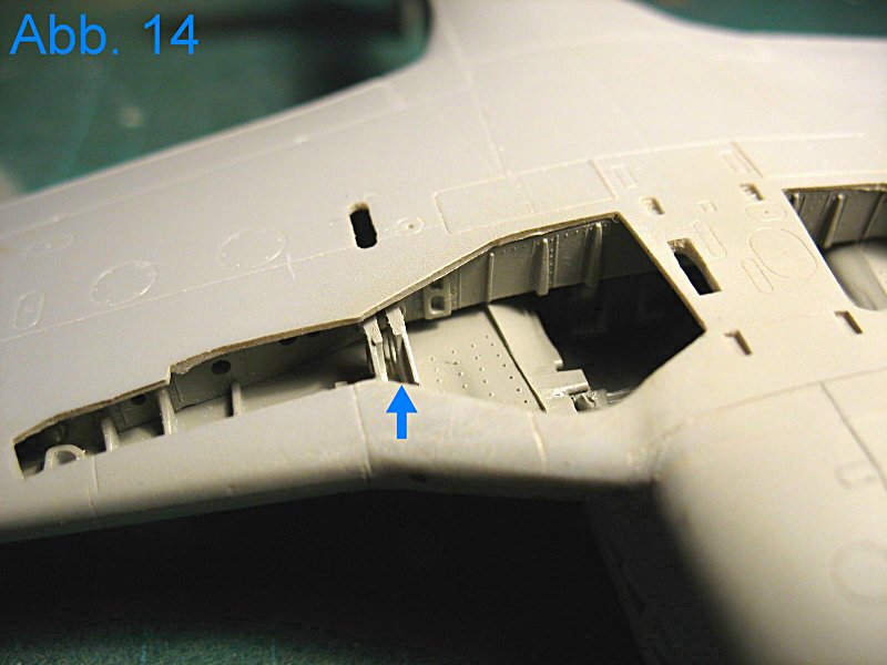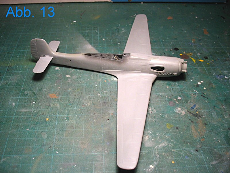 Nachdem diese Hürde genommen war, kam es zur Hochzeit und im Gegensatz zu mehreren negativen Berichten erwies sich die Passform im Bereich Flügel-Rumpf-Übergang bei meinem Bausatz als völlig problemlos. Einzig im linken vorderen Bereich war etwas Spachteln angezeigt (Abb. 13).
