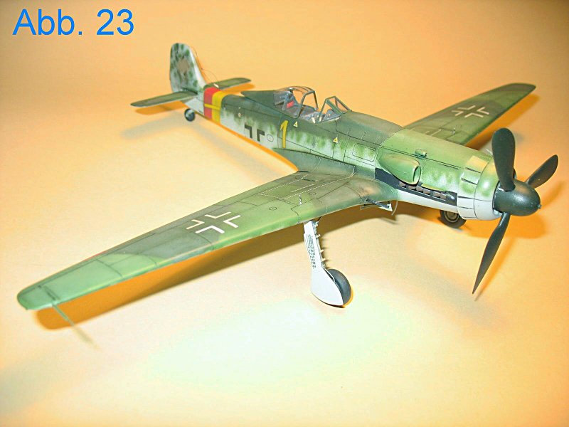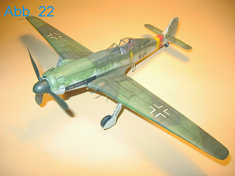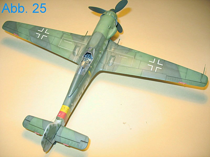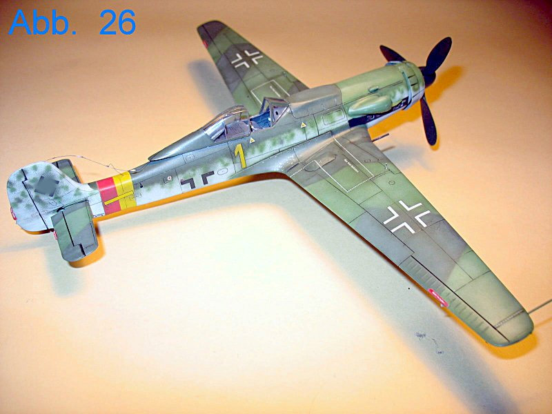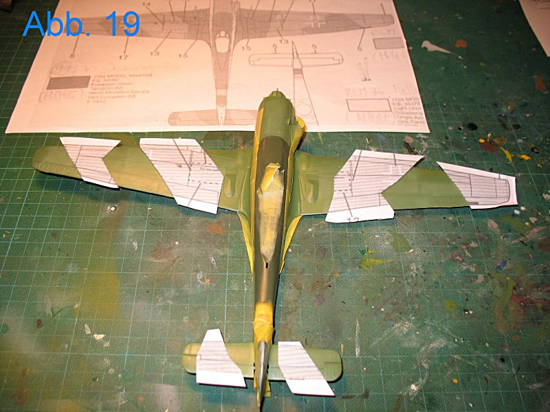 Da die Farbgrenzen beim Original ziemlich hart sind, habe ich die Bemalungsanleitung um den Faktor 208% vergrößert, die Schablonen passend zugeschnitten und leicht schwebend mittels White-Tack-Kügelchen befestigt (Abb. 19). Anschließend habe ich die Innenflächen der Paneele mit der jeweiligen Tarnfarbe, vermischt mit ca. 20 % weiß aufgehellt. Dann wurde noch einmal die Tarnfarbe ohne Aufhellung leicht übergenebelt. Es folgte die obligatorische Versiegelung mit Future und nach 24 Stunden Durchtrocknen ein vorsichtiges Überschleifen mit Micro Mesh Schleifleinen Körnung 4000, um kleine Unebenheiten auszugleichen. Das gelb-rote Reichsverteidigungsband habe ich, statt das Decal zu verwenden lieber mit Gunze H414 Rot RLM23 und H413 RLM Gelb 04 gebrusht. Der Propeller erhielt einen Anstrich in H065 RLM 70 Schwarzgrün, wie in der Bemalungsanleitung angegeben und durch die Originalfotos bestätigt ohne Spirale.