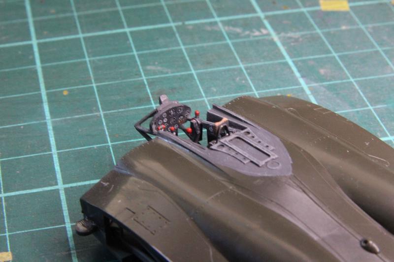 Die Landeklappen habe ich ausgesägt und leicht abgesenkt wieder angeklebt. Da ich eine fiktive Einsatzmaschine darstellen wollte, wurden die MK 103 vor dem Einbau mit mehrfachen Bohrungen versehen. Zwar nicht ganz korrekt, da es zu wenige Bohrungen sind, aber dennoch deutlich besser als ohne.