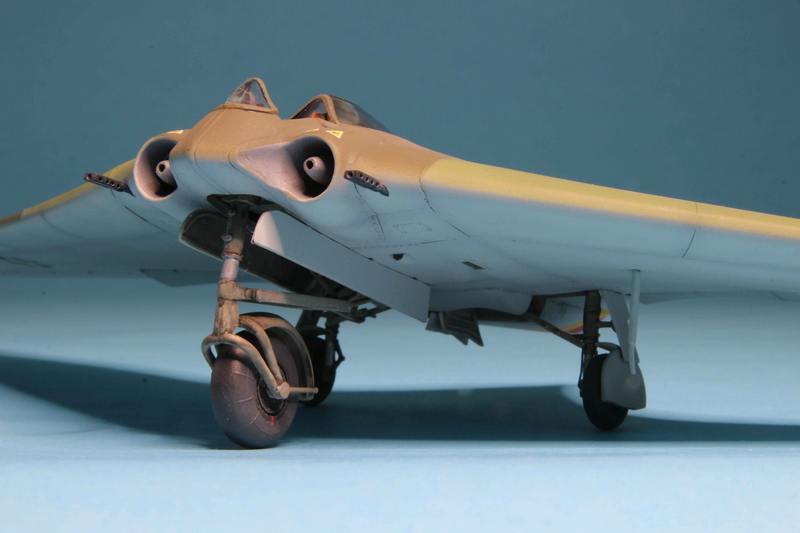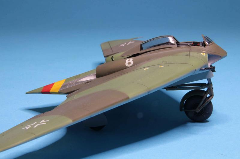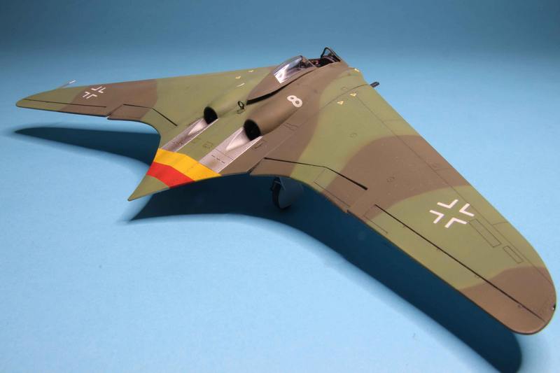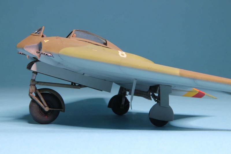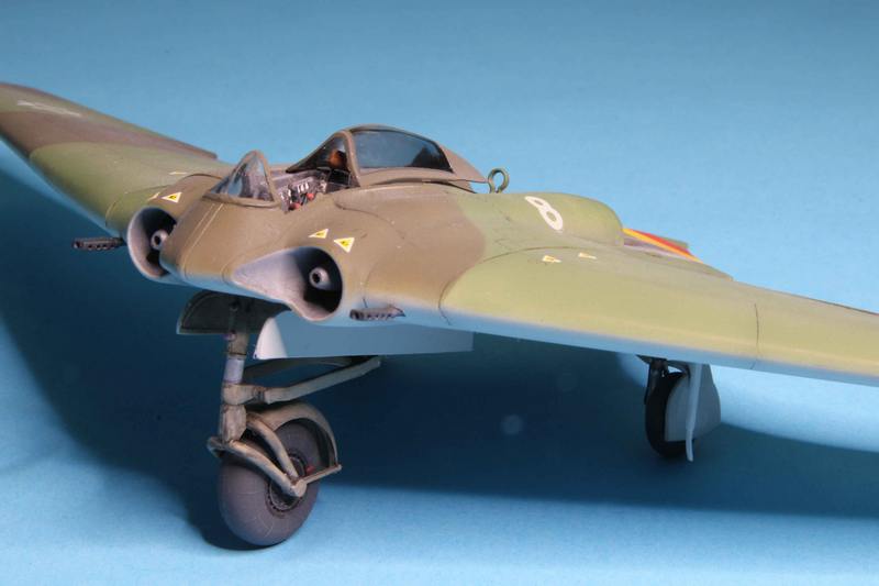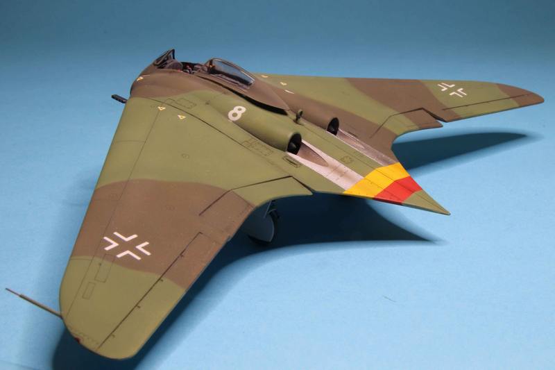 Das Staurohr fertigte ich aus Röhren von Albion Alloys. Die Tarnung ist in RLM 76/81/82 gehalten. Alles mit Gunze Farben gespritzt. Lediglich das Rumpfband ist mit Tamiya XF-7 als RLM 23 und Aeromaster 9036 als RLM 04 lackiert. Die silbernen Flächen hinter den Triebwerken sind mit Alclad White Aluminium bemalt.
