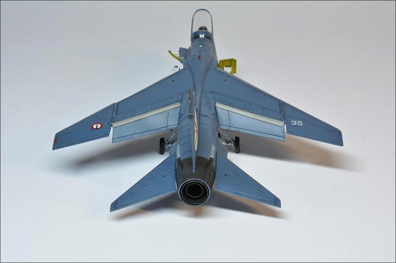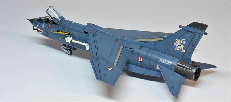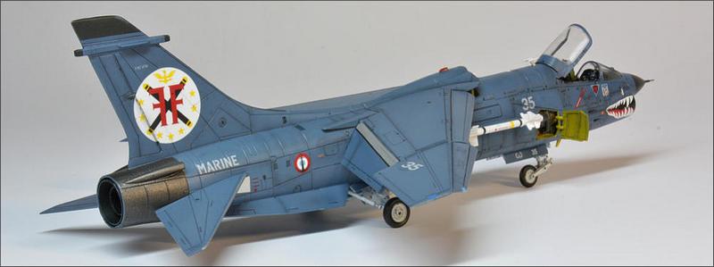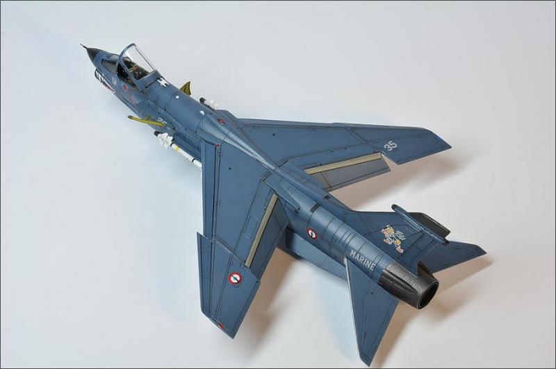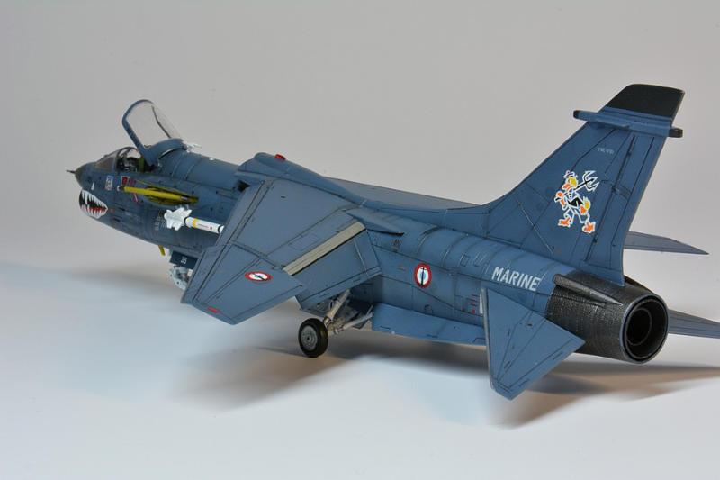 Als Grundfarbe kam H-42 Blue Gray von Hobby Color zum Einsatz welche dien Originalton recht gut trifft. Die Decals stammen aus dem Bausatz und stellen eine Maschine mit Sonderlackierung anlässlich der letzten Einsatzfahrt der Crusader dar. Links auf dem Leitwerk sieht man das Wappen der Marinestaffel 12F, rechts das des Trägers Foch.