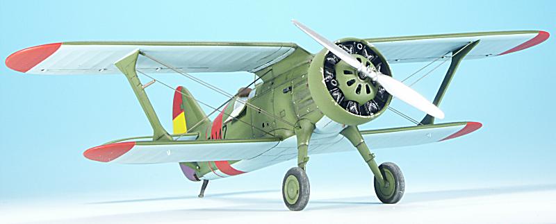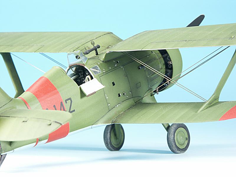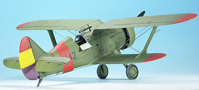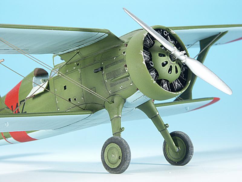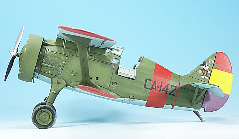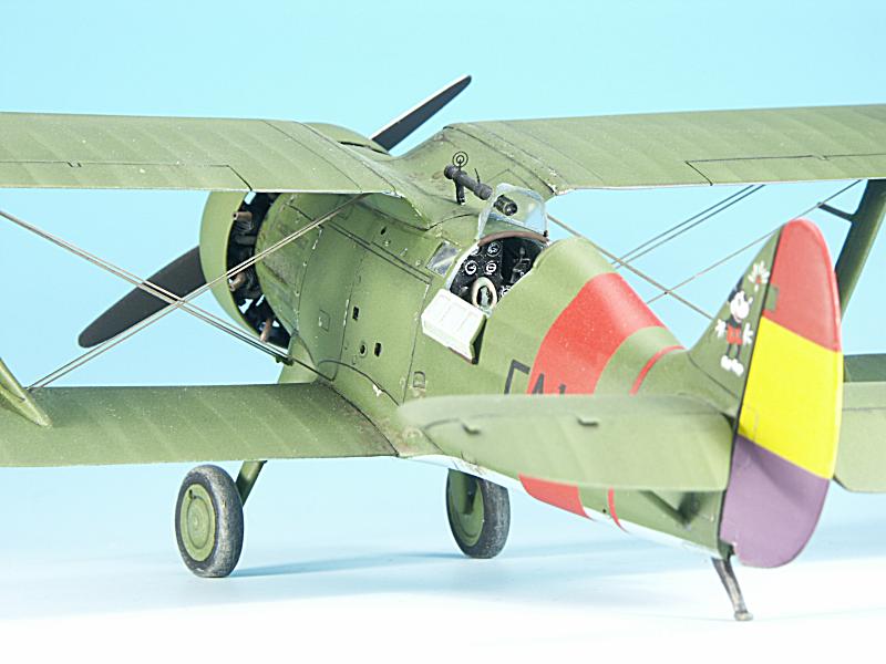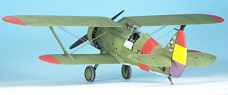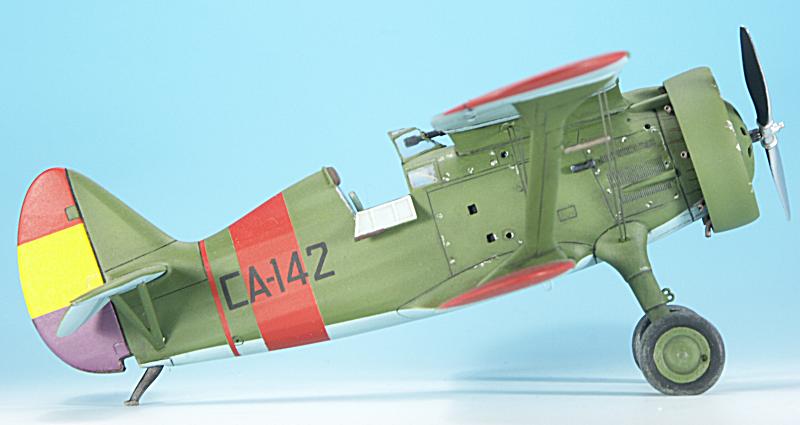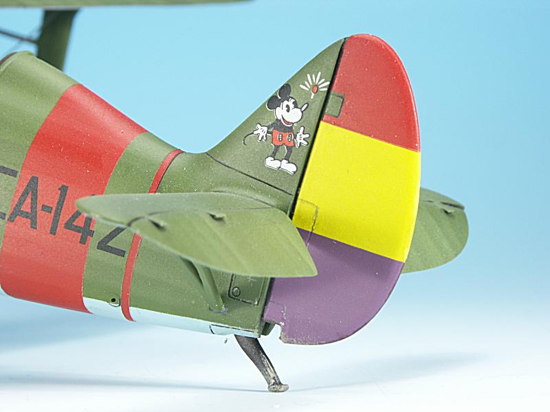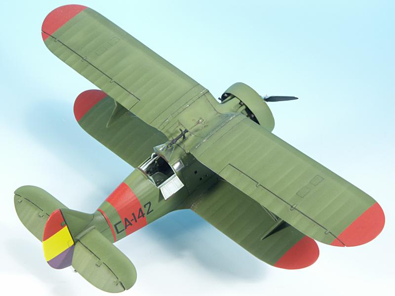 Lackiert wurde das Modell in den Farben der I-15 von Capitán Vicente Castillo, der diese Maschine im Dezember 1938 bei der 1. Escuadrilla de Chatos von Monjos, bei Barcelona, aus geflogen hat. Dazu brachte ich zuerst die typischen roten Markierungsstreifen der republikanischen Flugzeuge im spanischen Bürgerkrieg auf. Die Unterseiten wurden danach hellblau (Model Master 2126) und die Oberseiten grün (Humbrol 150) lackiert.