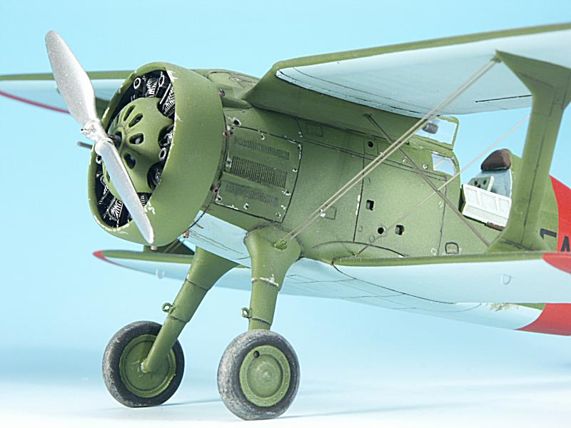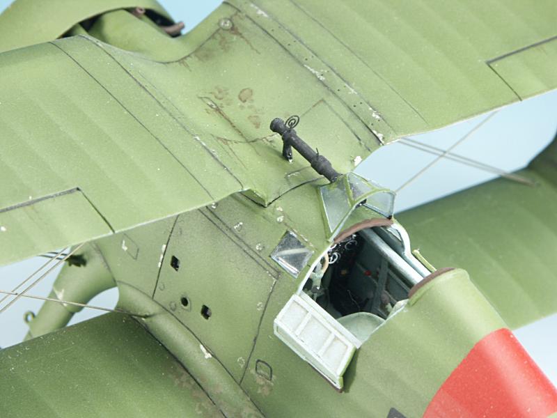 Anzumerken ist, dass die Befestigungspunkte der beiden Tragflächenstreben auf den unteren Tragflächen falsch gekennzeichnet sind und zu weit innen liegen. Die jeweils richtige Position befindet sich eine Flächenrippe weiter außen. Mit Plastiksheet und Spachtelmasse wurde zudem der zu kurze Lufteinlauf auf der Oberseite des Vorderrumpfes verlängert.