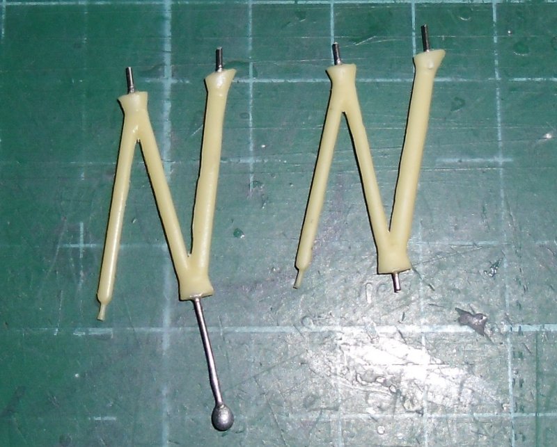 Das Fahrwerk und die Tragflächenstützen sollten plan angeklebt werden. Das war mir zu unsicher, deshalb habe ich alle Klebestellen mit einem Drahtstift versehen, siehe Bild 003. Dadurch ließ sich alles besser positionieren. Für die Spanndrähte habe ich 0,08 mm dicke Angelschnur genommen. An den entsprechenden Stellen wurden die Tragflächen durchbohrt, die Schnüre durchgezogen und mit Sekundenkleber fixiert. Nach dem Trocknen konnten die überstehenden Schnüre abgeschnitten und die Stellen glatt geschliffen werden.