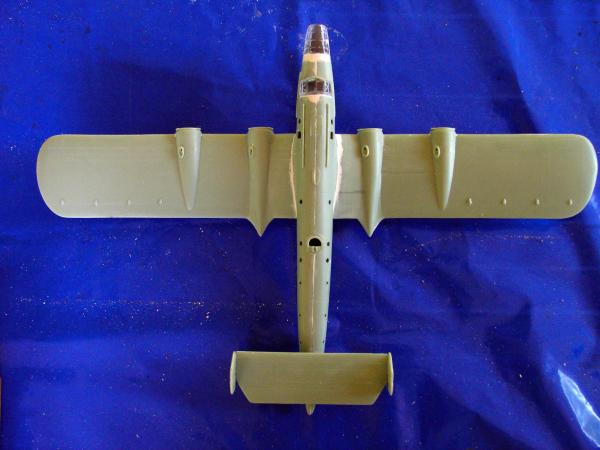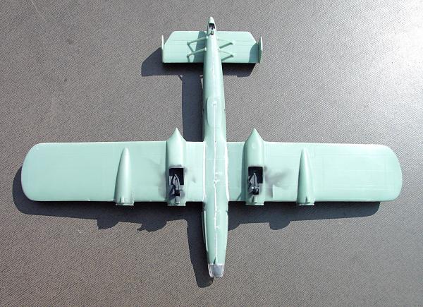 Die Fahrwerksverkleidung sieht auf den Bildern irgendwie anders aus, zu undeutliche Bilder und fehlende Unterlagen zwangen mich, es nach Bauplan zu bauen. Beim Einbau der Fahrwerksbeine darauf achten, daß sie senkrecht nach unten weisen, sonst passen sie sich der Tragflächenebene an und sitzen schief. Nach Bildern kommt eine FuBl1-Antenne links vorne unter den Rumpf, der Mast für die Schleppantenne mittig vorne unter den Rumpf, ungefähr in Höhe der Tragflächenvorderkante. Außerdem auf dem rechten Rumpfrücken eine Antennenanlage, die aus vier kurzen Masten besteht. Es fehlt dann der Antennenmast auf dem Rumpf hinter der Kanzel. Oft ist auf den Bildern aber auch nur dieser Mast zu sehen.