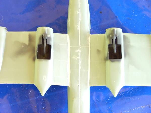 Auf vielen Fotos sind die kleinen Fenster im hinteren Rumpfbereich nicht zu erkennen. Es mag an der Bildqualität liegen, aber ich habe es mir leicht gemacht und alle nicht erkennbaren Fenster zugespachtelt. Die beiden sogenannten Paddelausgleiche unter den Tragflächen muß man selbst herstellen. Dies waren unter jedem Außenflügel angeordnete von nach vorne ragenden Armen mit Paddelflächen. Die Funktionsweise ist in dem Artikel von Herrn Kössler im Modell Magazin 05/76 zu der BV 222 hervorragend beschrieben.